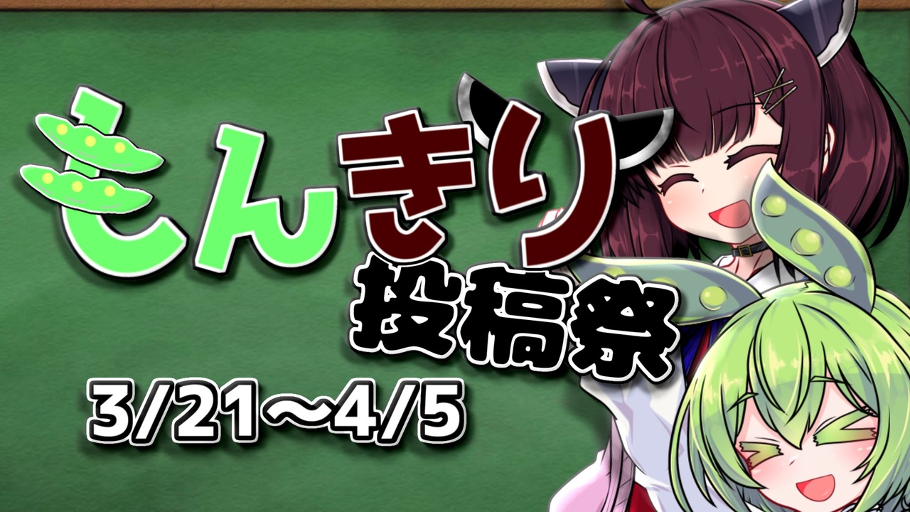 <span style="font-size: 24px;"><strong>もんきり作品んもっと増えろ!!!!!!!!!!!!!!!!!!!</strong></span><br><br><span style="font-size: 18px;"><strong>開催期間</strong></span><br>2026/3/21~4/5<br><br><span style="font-size: 18px;"><strong>レギュレーション</strong></span><br>・ずんだもんときりたんの2人がメインとなる動画を投稿すること<br><br>・コッショリ・ダークサイドなどを含む場合はゾーニングを行う事<br><br>・『第2回もんきり投稿祭』『もんきり』のタグロックを行う事(2は半角英数字です)<br><br>・この動画を親作品登録すること<br><br>投稿祭のロゴ<br><a href="https://commons.nicovideo.jp/works/nc456363" target="_blank" rel="noopener">nc456363</a><br><br>VOICEVOX:ずんだもん・東北きりたん<br><br>追記<br>・ずんだもんと言えば人型だけど妖精形態ずんだもんもいいのかな?<br>OKです!<br><br><a target="_blank" href="https://qa.nicovideo.jp/faq/show/19424?site_domain=default" style="font-size: 13px;color: #657586; text-decoration: underline; line-height: 1.4">この動画は投稿者によって修正されました</a>