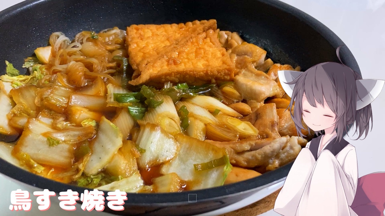 今回はジューシーな鳥すき焼き!<br>お手頃な贅沢を味わってください!<br>【材料】<br>鶏もも肉:300g程度<br>白菜:200g<br>ネギ:1本<br>しらたき:100g程度<br>豆腐や厚揚げ<br>しょうゆとみりん:大さじ4<br>砂糖:大さじ2<br>水:120ml<br><br>最近twitchでゲーム配信やってます!実はアバターオリジナル!<br>是非遊びに来てください!フォローもよろしくお願いします!<br><a href="https://www.twitch.tv/arch2801_1" target="_blank" rel="noopener nofollow">https://www.twitch.tv/arch2801_1</a><br><br>※YouTube側でも投稿しています!<br><a href="https://youtu.be/tPzbTcRVx1Y" target="_blank" rel="noopener nofollow">https://youtu.be/tPzbTcRVx1Y</a><br>そして是非チャンネル登録もお願いします!<br><a href="http://www.youtube.com/channel/UCgj7RfHha73UONAF-zJVidg?view_as=subscriber?sub_confirmation=1" target="_blank" rel="noopener nofollow">http://www.youtube.com/channel/UCgj7RfHha73UONAF-zJVidg?view_as=subscriber?sub_confirmation=1</a><br><br>立ち絵:桧野 拓海様<br><a href="https://seiga.nicovideo.jp/seiga/im10613314" target="_blank" rel="noopener nofollow">https://seiga.nicovideo.jp/seiga/im10613314</a><br>フリーBGM MusMus様<br><a href="https://musmus.main.jp/info.html" target="_blank" rel="noopener nofollow">https://musmus.main.jp/info.html</a><br>ミスキー:@arch2801 | Misskey.io<br>Twitter:<a href="https://twitter.com/arch2801_" target="_blank" rel="noopener nofollow">https://twitter.com/arch2801_</a>