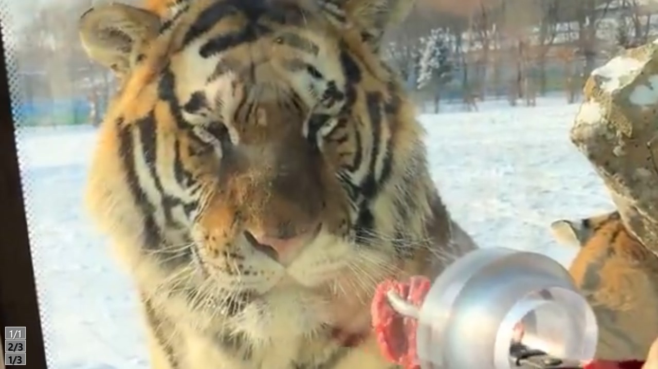 ホモと見る面倒くさそうに餌を食べてあげるトラ