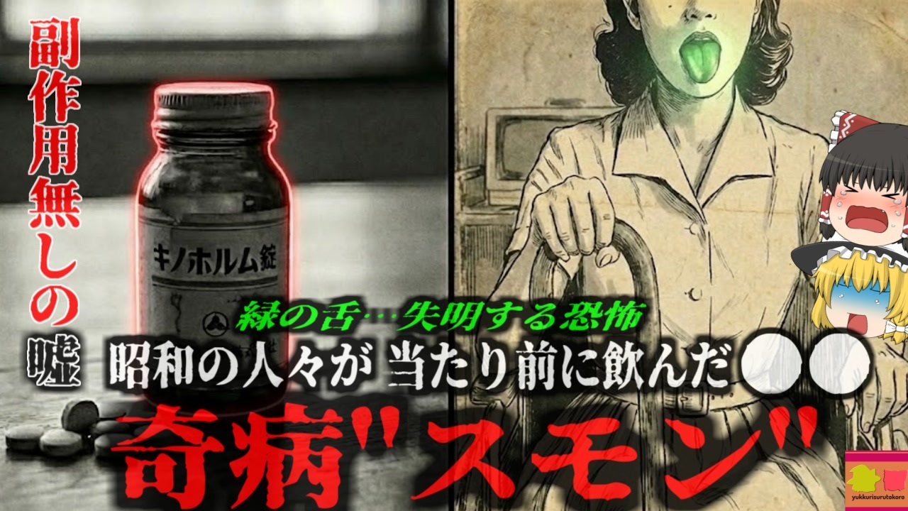 <a href="#" class="seekTime" data-seekTime="00:07" onclick="seekNicoPlayer('#00:07'); return false;">#00:07</a> 視聴上の注意<br><a href="#" class="seekTime" data-seekTime="00:55" onclick="seekNicoPlayer('#00:55'); return false;">#00:55</a> 本編開始<br><a href="#" class="seekTime" data-seekTime="1:15" onclick="seekNicoPlayer('#1:15'); return false;">#1:15</a> 高度成長期だったが食中毒が致命的だった<br><a href="#" class="seekTime" data-seekTime="1:45" onclick="seekNicoPlayer('#1:45'); return false;">#1:45</a> 魔法の整腸剤『キノホルム』<br><a href="#" class="seekTime" data-seekTime="2:32" onclick="seekNicoPlayer('#2:32'); return false;">#2:32</a> 副作用はないと謳われていた<br><a href="#" class="seekTime" data-seekTime="3:18" onclick="seekNicoPlayer('#3:18'); return false;">#3:18</a> 家庭の常備薬に<br><a href="#" class="seekTime" data-seekTime="4:07" onclick="seekNicoPlayer('#4:07'); return false;">#4:07</a> 1950年代後半に現れた異変<br><a href="#" class="seekTime" data-seekTime="5:11" onclick="seekNicoPlayer('#5:11'); return false;">#5:11</a> 「亜急性脊髄視神経症(Subacute Myelo-Optico-Neuropathy)<br><a href="#" class="seekTime" data-seekTime="6:02" onclick="seekNicoPlayer('#6:02'); return false;">#6:02</a> 人々の誤解が生んだ悲劇<br><a href="#" class="seekTime" data-seekTime="7:22" onclick="seekNicoPlayer('#7:22'); return false;">#7:22</a> スモン研究評議会はウイルスの研究がメインとなり…<br><a href="#" class="seekTime" data-seekTime="7:53" onclick="seekNicoPlayer('#7:53'); return false;">#7:53</a> 1970年に発見された「緑色の舌」<br><a href="#" class="seekTime" data-seekTime="8:58" onclick="seekNicoPlayer('#8:58'); return false;">#8:58</a> 大規模疫学調査で判明した真実<br><a href="#" class="seekTime" data-seekTime="9:45" onclick="seekNicoPlayer('#9:45'); return false;">#9:45</a> キレート効果と失明メカニズム<br><a href="#" class="seekTime" data-seekTime="11:42" onclick="seekNicoPlayer('#11:42'); return false;">#11:42</a> 販売中止した途端患者が減る<br><a href="#" class="seekTime" data-seekTime="12:29" onclick="seekNicoPlayer('#12:29'); return false;">#12:29</a> 製薬会社がひた隠しにした不都合な真実<br><a href="#" class="seekTime" data-seekTime="15:01" onclick="seekNicoPlayer('#15:01'); return false;">#15:01</a> 原題の医薬品行政の礎と教訓<br><br><br><br>引用・出展・参考文献(視聴者提供資料など<br>薬害スモン全史 第一巻 被害実態編<br>著者 スモンの会全国連絡協議会 編; 出版社 労働旬報社; 刊行年 昭56;<br>Wikipedia 1950年代の日本<br><a href="https://x.gd/cS3Qn" target="_blank" rel="noopener nofollow">https://x.gd/cS3Qn</a><br>クリオキノール<br><a href="https://x.gd/BB5uz" target="_blank" rel="noopener nofollow">https://x.gd/BB5uz</a><br>厚生労働省検疫所FORTH<br>アメーバ赤痢(Amebiasis)<br><a href="https://x.gd/1S15oK" target="_blank" rel="noopener nofollow">https://x.gd/1S15oK</a><br>朝日新聞 戦後史<br><a href="https://x.gd/vbpjt" target="_blank" rel="noopener nofollow">https://x.gd/vbpjt</a><br>独立行政法人 国立病院機構 鈴鹿病院<br><a href="https://suzuka.hosp.go.jp" target="_blank" rel="noopener nofollow">https://suzuka.hosp.go.jp</a> <br>大原社研 スモンの会全国連絡協議会・薬害スモン関係資料公開の意義と課題<br><a href="https://x.gd/3dphW" target="_blank" rel="noopener nofollow">https://x.gd/3dphW</a><br>Japan in the 1950s<br><a href="https://x.gd/jVUgsK" target="_blank" rel="noopener nofollow">https://x.gd/jVUgsK</a><br />※この動画は過去の事件を知り、現在でも同じことが発生する危険性を再認識、関与しないように促すための動画であり、視聴者を扇動、動揺を誘うためのコンテンツではありません。<br><br>ご要望にお応えして、メンバーシップの開設を行いました。<br>下記URLからも登録可能ですので、ご興味がある方は是非ご参加ください。<br><a href="https://www.youtube.com/channel/UCcT5a1J7XJW7CLYI2RKl4pw/join" target="_blank" rel="noopener nofollow">https://www.youtube.com/channel/UCcT5a1J7XJW7CLYI2RKl4pw/join</a><br><br><br>Twitter<br>→<a href="https://twitter.com/yukkurisurutoko" target="_blank" rel="noopener nofollow">https://twitter.com/yukkurisurutoko</a><br><br>取り急ぎ、簡易的にですがマイリストを作りました。<br>【ゆっくり解説】事故・事件関係紹介リスト <br><a href="https://www.nicovideo.jp/mylist/71034319" target="_blank" rel="noopener nofollow">https://www.nicovideo.jp/mylist/71034319</a><br>【ゆっくり解説】放射線系事故<br><a href="https://www.nicovideo.jp/mylist/71034368" target="_blank" rel="noopener nofollow">https://www.nicovideo.jp/mylist/71034368</a><br>【ゆっくり解説】鉄道系事故・事件関連<br><a href="https://www.nicovideo.jp/mylist/71034379" target="_blank" rel="noopener nofollow">https://www.nicovideo.jp/mylist/71034379</a>