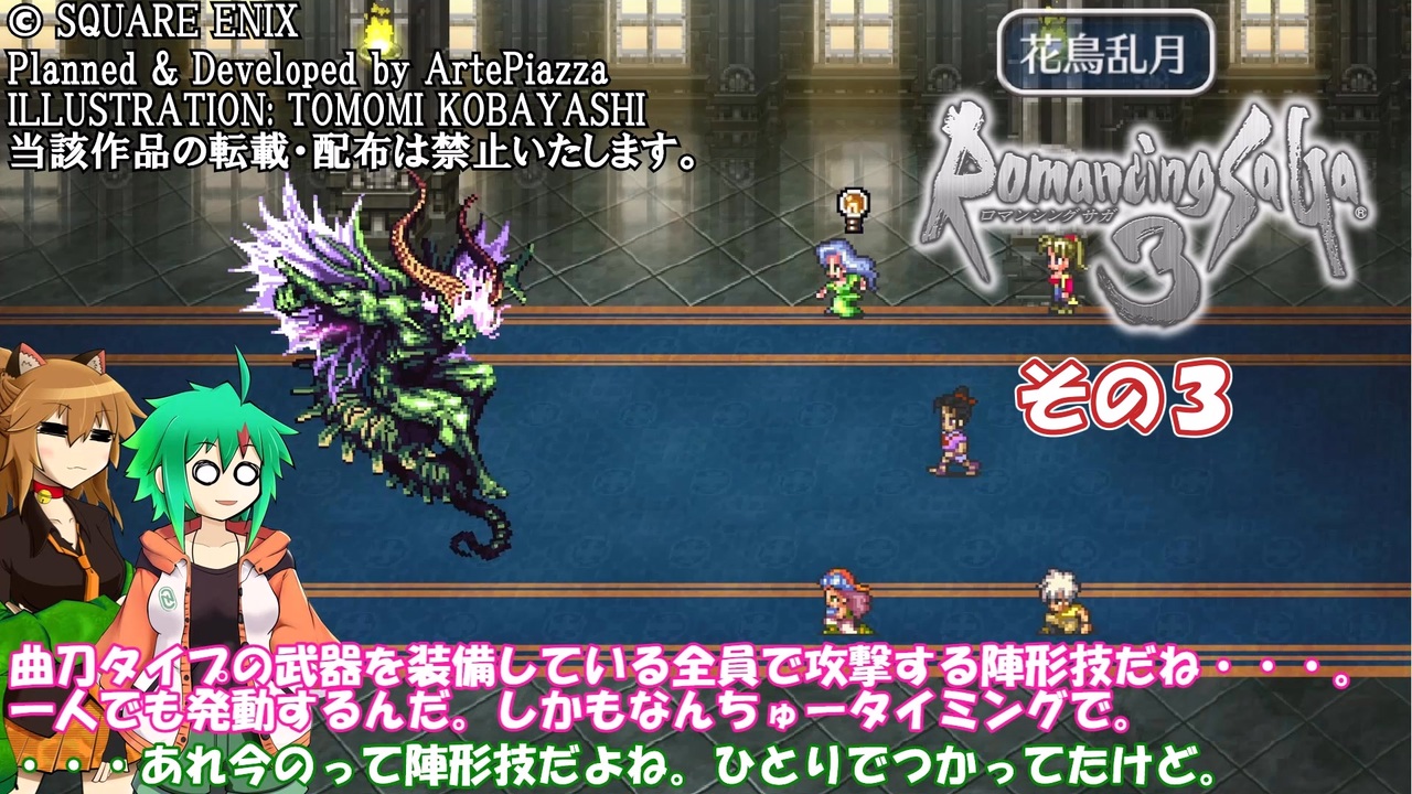 この動画はスチーム版ロマンシング・サガ3のかるーい縛り実況動画です。<br><br>●縛り?内容<br>・サラは控えでコマンダーモードオンリー<br>(ごく一部の戦闘では強制参戦させられるため術攻撃許可)<br>・パーティメンバーの武器や術は指定のみ使用。<br><br>※43ちゃん、490姉さんは470/43様のオリジナルキャラクターです<br> 参考動画:<a href="https://www.nicovideo.jp/watch/sm40839724" class="watch">sm40839724</a> <a href="https://www.nicovideo.jp/watch/sm44979749" class="watch">sm44979749</a><br>※イクシース、ミントはろーぐ様のオリジナルキャラクターです。<br> 参考動画:<a href="https://www.nicovideo.jp/watch/sm42425613" class="watch">sm42425613</a><br><br><a href="https://www.nicovideo.jp/watch/sm45829035" class="watch">sm45829035</a> ← 前 次 → <a href="https://www.nicovideo.jp/watch/sm45835797" class="watch">sm45835797</a><br>マイリスト →<a href="https://www.nicovideo.jp/mylist/70943031" target="_blank" rel="noopener">mylist/70943031</a><br><br>※使用Voice(及び配役)<br>VOICEVOX:春日部つむぎ(ネコ耳) (きりたん)四国めたん(イクシース) No.7(ミント・490)<br>CoeFont:アリアル(Voiced by <a href="https://CoeFont.cloud" target="_blank" rel="noopener nofollow">https://CoeFont.cloud</a>(490))<br>立ち絵:ネコ耳(470/43様より頂きました)<br> 43・490(470/43様自作)<br> イクシース・ミント(からい先生のめたち絵)<br><br>© SQUARE ENIX<br>Planned & Developed by ArtePiazza<br>ILLUSTRATION: TOMOMI KOBAYASHI<br>当該作品の転載・配布は禁止いたします。