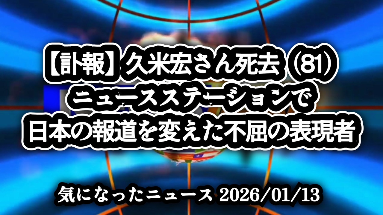【訃報】久米宏さん死去(81)|『ニュースステーション』で日本の報道を変えた不屈の表現者<br><br>久米宏、逝く<br>報道を変えた男<br><br>あらすじ<br>久米宏さんが2026年1月1日、肺がんのため81歳で死去した。『久米宏』『訃報』として日本中に衝撃が走った。『ニュースステーション』では『報道』をショーとして成立させ、『テレビ史』を塗り替えた『キャスター』だった。『ザベストテン』では黒柳徹子との名司会で『昭和』『平成』の音楽と『メディア』文化を牽引。忖度せず語る『表現者』の姿は、今なお強い問いを投げかけている。<br><br>◆今回の台本&詳細<a href="https://keiichiro8140.hatenablog.com/entry/26011333222" target="_blank" rel="noopener nofollow">https://keiichiro8140.hatenablog.com/entry/26011333222</a><br><br>◆これまでの動画<a href="https://x.gd/sPXoJ" target="_blank" rel="noopener nofollow">https://x.gd/sPXoJ</a><br><br>◆もしも(BAN)の時のためのマイリンク集<a href="https://lit.link/K-16_News44" target="_blank" rel="noopener nofollow">https://lit.link/K-16_News44</a><br><br>ご覧いただきありがとうございます<br>m(_ _)m<br><br>気になったニュース 2026/01/13<br><br />著作権、肖像権に配慮して作成しております。<br><br>◆気になったニュースの台本!?<br>メモ代わりに作った台本をそのままあげてます<br><a href="https://keiichiro8140.hatenablog.com/." target="_blank" rel="noopener nofollow">https://keiichiro8140.hatenablog.com/.</a><br><br><br>ここからはシリーズ紹介<br><br><br>◆ ワクチン解毒・デトックス<br><a href="https://x.gd/fZweg" target="_blank" rel="noopener nofollow">https://x.gd/fZweg</a><br><br>◆ウイリアム・マキス博士のがん治療(イベルメクチン・フェンベンダゾール等)<br><a href="https://x.gd/AtFYS" target="_blank" rel="noopener nofollow">https://x.gd/AtFYS</a><br><br>◆予防接種健康被害救済制度<br><a href="https://x.gd/0xK9x" target="_blank" rel="noopener nofollow">https://x.gd/0xK9x</a><br><br>◆気になったニュース #1501~<br><br>◆ 【ショートver】気になったニュース<br><a href="https://x.gd/7MxXC" target="_blank" rel="noopener nofollow">https://x.gd/7MxXC</a><br><br>◆ 気になったニュース #1001~<br><a href="https://x.gd/Lp8gv" target="_blank" rel="noopener nofollow">https://x.gd/Lp8gv</a><br><br>◆ 気になったニュース #501~<br><a href="https://x.gd/EmbS4" target="_blank" rel="noopener nofollow">https://x.gd/EmbS4</a><br><br>◆ 気になったニュース #1~#500<br><a href="https://x.gd/uPhNb" target="_blank" rel="noopener nofollow">https://x.gd/uPhNb</a><br><br>◆ X(旧Twitter)・テレグラムで気になった情報<br><a href="https://x.gd/YG6FT" target="_blank" rel="noopener nofollow">https://x.gd/YG6FT</a><br><br>◆ 日比谷5万人パレードデ⚪生放送アーカイブ動画<br><a href="https://x.gd/3CHJv" target="_blank" rel="noopener nofollow">https://x.gd/3CHJv</a><br><br>◆日比谷5万人パレード⚪モのマイリスト作ってみました<br><a href="https://nico.ms/mylist/76828848?ref=sp_other" target="_blank" rel="noopener nofollow">https://nico.ms/mylist/76828848?ref=sp_other</a><br><br>◆3.30 令和の百姓⚪⚪<br><a href="https://www.nicovideo.jp/series/511791?ref=garage_share_other" target="_blank" rel="noopener nofollow">https://www.nicovideo.jp/series/511791?ref=garage_share_other</a><br><br>◆ 及川幸久さんの【XNEWS】シリーズ<br><a href="https://x.gd/3k78K" target="_blank" rel="noopener nofollow">https://x.gd/3k78K</a><br><br>◆これまでの動画<a href="https://x.gd/sPXoJ" target="_blank" rel="noopener nofollow">https://x.gd/sPXoJ</a><br><br>◆もしも(BAN)の時のためのマイリンク集<a href="https://lit.link/K-16_News44" target="_blank" rel="noopener nofollow">https://lit.link/K-16_News44</a><br><br>