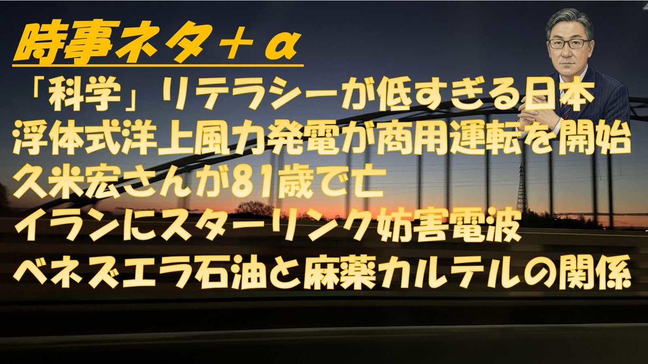 ◆鳥集徹<br>#125 「科学」リテラシーが低すぎるニッポン ~アンフェアな「医学」を見抜くために~<br><br>2026年01月12日、佐藤優・高嶋ひでたけオールナイトニッポン月イチ<br><br>◆野中しんすけ<br>【麻生太郎氏が大激怒・・】高市総理の覚悟と麻生太郎氏の怒りのメッセージとは!?ついに「麻生切り」を始めたか!?<br><br>◆TTMつよし<br>高市内閣が衆院解散する証拠が続々、麻生太郎も地元で言及 岡田克也の親中イオングループで兄岡田元也が辞任要求される ガチで薛剣総領事消息不明に 公明党が立憲と選挙協力に<br><br>◆横森一輝<br>第700回収録 衆院解散は1/23?自民が勝つための鍵はスパイ防止法<br><br>◆古舘伊知郎<br>トランプ大統領中間選挙を見据えた世界中での大暴れ。アメリカ国民の冷ややかな目。<br><br>衆院解散の可能性が急浮上。解散に踏み切る高市総理の心中とは。<br><br>◆安部英と薬害エイズ<br><br>鴨川メガソーラー計画、FIT認定が失効 高値売電の権利消滅<br><br>国内初、浮体式洋上風力発電所が商用運転を開始。洋上風力発電の拡大につながるか<br><br>冬のロシアで中国産EV車が棺桶に<br><br>雪道と階段を踏破する自律配送ロボ「RIVR ONE」が登場<br><br>久米宏さんが81歳で亡くなった<br><br>前橋市長選でラブホテル問題で辞職した小川氏再選<br><br>①支持率高いうちに解散、国民の信任を得たことにしたい<br>②台湾有事発言で日中関係悪化、レアアース輸入停止<br>③高市首相や自民議員の旧統一教会との関係の深さが露見<br>④連立する維新の「国保逃れ」<br>国会で追及される前に逃げる。<br><br>日本での就職をやめて帰国する人が急増。 <br><br>◆J_SATO<br>イランの抗議デモで500人、600人が死亡したというニュースが流れているが<br><br>速報‼️ 米国務省は米国民に対しイランを出国するよう警告しました。<br><br>スターリンク妨害システムだった。<br>イラン政府はインターネットと通信を完全に遮断し、このシステムを用いてスターリンクの通信を遮断することに成功した。<br><br>イラン、史上初の衛星インターネット遮断 スターリンクに「キルスイッチ」<br><br>◆Chihiro Sato-Schuh<br>【ベネズエラの石油と麻薬カルテルの関係】<br><br>◆古村治彦<br>ドナルド・トランプ大統領のヴェネズエラ攻撃は成功したが、それが成功体験になって連続して実行されればそれはトランプの失敗になる<br><br>軍の航空機をわざわざ「民間の飛行機」そっくりに塗装して、正体を隠した状態で攻撃に参加させていた。