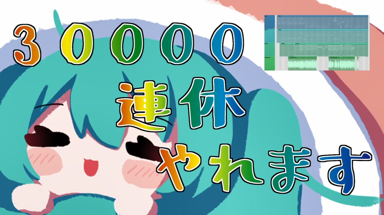 ま子(まこ)と申します!よろしくお願いします!<br><br>曲 ま子 <a href="https://x.com/masu_0120" target="_blank" rel="noopener nofollow">https://x.com/masu_0120</a> <a href="https://nico.ms/mylist/77785136" target="_blank" rel="noopener nofollow">https://nico.ms/mylist/77785136</a><br>イラスト たまちさん <a href="https://x.com/tamachit4m" target="_blank" rel="noopener nofollow">https://x.com/tamachit4m</a><br><br>オケと歌詞 <a href="https://piapro.jp/masu_0120" target="_blank" rel="noopener nofollow">https://piapro.jp/masu_0120</a><br><br>ベーシストもやってます!よろしくお願いします! <a href="https://www.youtube.com/@masu_0120" target="_blank" rel="noopener nofollow">https://www.youtube.com/@masu_0120</a><br><br>30000連休やれます / 初音ミク<br><br>はじめまして おはようございます<br>僕のいない世界はどうですか<br>おしゃべりにHPが見えちゃう<br>好きな季節がなくて困ってる<br>アドバイスもらって外出ても<br>外だなあ としか思わんすよね<br>肺の奥 息を吸い込む意味が<br>おおげさにありそうで嫌ですよね<br><br>行かないでくれ 明けないでくれ<br>すでに日々の減る速度がはやい<br>もうビビって笑うしかないです<br>ぼく30000連休やれます<br><br>また明日が言いたくないから<br>明日にならなくてもいいのに<br>気が済むまで夜のままでいい<br>今日も気が済まなくてだめでした<br>取り返しがつかなくなりそう<br>空っぽのゴミ箱 蹴って逃げる<br>また明日から優しくしてね<br>いや別に 今日でもいいけど<br><br>きらきら きらきら 透き通る影<br>ふわふわ 揺れて いいですね<br>ゆらゆら したまま 吸い込まれてく<br>なあ 頼む 連れてってくれ<br><br>また明日が言いたくないから<br>明日にならなくてもいいのに<br>気が済むまで夜のままでいい<br>今日も気が済まなくてだめでした<br>なんか置いてかれてる気がする<br>たまには連絡でもしますか<br>また明日からは戦おうぜ<br>今は別になにもしませんが<br><br>もし僕がお布団から出れたら<br>生きてる間にまた会おうぜ<br><br>頼むぜ<br><br>マジで