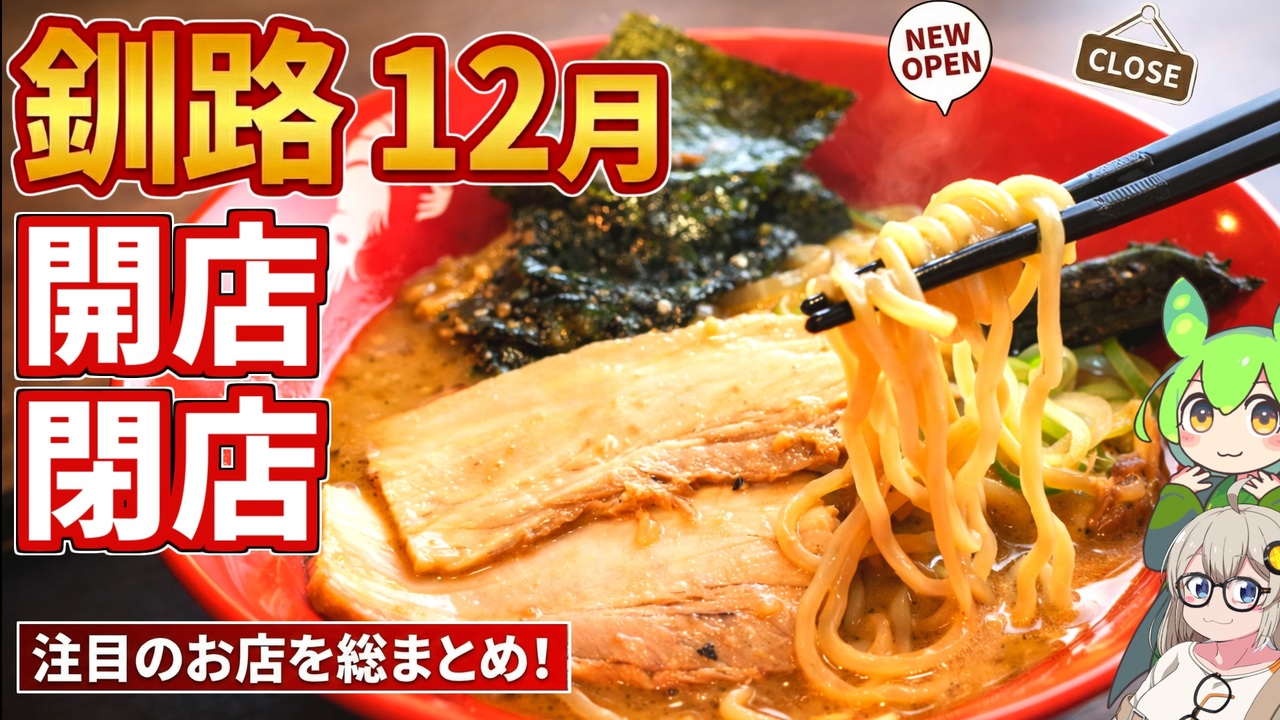 釧路で2025年12月に開店閉店するお店の一覧です<br>数店は実際に行ってみました<br><br>開店閉店情報は随時募集していますので<br>Xのプロフ欄にあるマシュマロからお願いいたします<br><br> gather:<a href="https://gather-diner.vercel.app/?utm_source=ig&utm_medium=social&utm_content=link_in_bio&fbclid=PAZXh0bgNhZW0CMTEAc3J0YwZhcHBfaWQMMjU2MjgxMDQwNTU4AAGn_-yYMCllygM2IuBCJGzNV1qo4cas6JC8riMujiyyICE7VDrJibdkwpYNDcs_aem_MAVuaNCU-LutalLP-_r4Ug" target="_blank" rel="noopener nofollow">https://gather-diner.vercel.app/?utm_source=ig&utm_medium=social&utm_content=link_in_bio&fbclid=PAZXh0bgNhZW0CMTEAc3J0YwZhcHBfaWQMMjU2MjgxMDQwNTU4AAGn_-yYMCllygM2IuBCJGzNV1qo4cas6JC8riMujiyyICE7VDrJibdkwpYNDcs_aem_MAVuaNCU-LutalLP-_r4Ug</a> <br><br>KeePerLABO:<a href="https://keeperlabo.jp/kushiro" target="_blank" rel="noopener nofollow">https://keeperlabo.jp/kushiro</a><br><br>URAR TERRACE:<a href="https://www.hokkaido-airports.com/ja/kushiro/foodcourtlp/" target="_blank" rel="noopener nofollow">https://www.hokkaido-airports.com/ja/kushiro/foodcourtlp/</a><br><br><br>●音声ソフト<br>VOICEVOX:ずんだもん<br><br><br><br>●X @acerola_vitamin <br><br /><span style="color: #ff0000; font-size: 24px;"><strong>釧路を紹介するブログ始めました</strong></span>:<a href="https://946de2100.com" target="_blank" rel="noopener nofollow">https://946de2100.com</a><br><br><span style="color: #ff0000; font-size: 16px;"><strong>●おススメ動画:</strong></span><span style="color: #ff0000; font-size: 18px;"><strong>【歴史解説】かつて 釧路を支配していたのは佐賀だった ~釧路元町の始まりと佐野孫右衛門の盛衰~</strong></span><br><br><a href="https://www.nicovideo.jp/watch/sm44267722" class="watch">sm44267722</a><br><br><br><span style="color: #ff0000; font-size: 18px;"><strong>●YouTubeチャンネルも登録よろしくお願いします</strong></span><br><strong>釧路チャンネル <a href="https://www.youtube.com/@znd-kaisetu" target="_blank" rel="noopener nofollow">https://www.youtube.com/@znd-kaisetu</a></strong><br>恋結シラリカソロチャンネル <a href="https://www.youtube.com/@enmusubi-shirarika" target="_blank" rel="noopener nofollow">https://www.youtube.com/@enmusubi-shirarika</a><br><br><br>ほしいものリスト <a href="https://www.amazon.jp/hz/wishlist/ls/2OUUB1JQSRUWG?ref_=wl_share" target="_blank" rel="noopener nofollow">https://www.amazon.jp/hz/wishlist/ls/2OUUB1JQSRUWG?ref_=wl_share</a><br>クリエイターサポート<a href="https://creator-support.nicovideo.jp/registration/116665199" target="_blank" rel="noopener nofollow">https://creator-support.nicovideo.jp/registration/116665199</a>