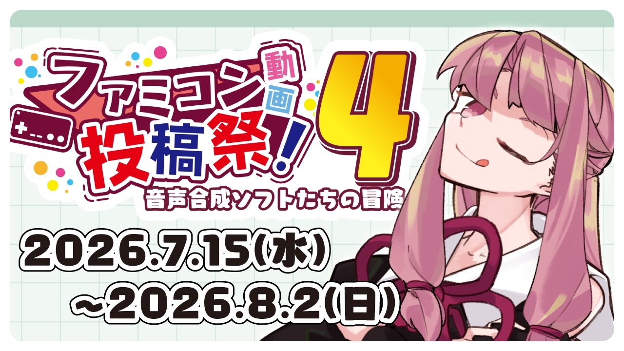 <br><span style="font-size: 18px;"><strong>今年もまだまだまだ!!<br>ファミリーコンピュータをテーマに盛り上がろう!!</strong></span><br><br>*詳細はこちら!(Googleドキュメント)<br>→<a href="https://docs.google.com/document/d/1_NFpR5kDlR6T90W2CHkRMFMgOPAJXlu5CAptrEZUwKA/edit?usp=sharing" target="_blank" rel="noopener nofollow">https://docs.google.com/document/d/1_NFpR5kDlR6T90W2CHkRMFMgOPAJXlu5CAptrEZUwKA/edit?usp=sharing</a><br><br>*スプレッドシートはこちら<br>→<a href="https://docs.google.com/spreadsheets/d/1Qi7GG6CBy9yjHb4Ad5ZXxGf1s6o4sTqFi0kPrZqDZpM/edit?usp=sharing" target="_blank" rel="noopener nofollow">https://docs.google.com/spreadsheets/d/1Qi7GG6CBy9yjHb4Ad5ZXxGf1s6o4sTqFi0kPrZqDZpM/edit?usp=sharing</a><br><br>--------------------------------------------<br><br><span style="font-size: 16px;"><strong>【開催期間】</strong></span>2026年7月15日(水)0:00〜8月2日(日)23:59<br><span style="font-size: 16px;"><strong>【参加タグ】</strong></span>ファミコン動画投稿祭4 ※<strong><u>タグロックをお願いします!</u></strong><br><span style="font-size: 16px;"><strong>【ロゴ】</strong></span><strong>【<a href="https://seiga.nicovideo.jp/seiga/im11733458" target="_blank" rel="noopener">im11733458</a>】</strong><br><br>--------------------------------------------<br><br>Twitter→<a href="https://twitter.com/hinaume014158n" target="_blank" rel="noopener nofollow">https://twitter.com/hinaume014158n</a><br /><br>---------------------------------------------------------<br><span style="color: #ff9900; font-size: 16px;"><strong>*VOCALOID6 AI 紲星あかり 公式デモソング 恋星キャラメリゼ</strong></span><br><span style="color: #434343;">動画担当しました!よろしくお願いします!</span><span style="color: #434343;"><strong>→</strong></span><span style="color: #ff9900;"><strong>【<a href="https://www.nicovideo.jp/watch/sm45034426" class="watch">sm45034426</a>】</strong></span><br><br><span style="color: #ff0000; font-size: 16px;"><strong>*ファミコン動画投稿祭4開催予定!!</strong></span><br>詳細はこちらから→<strong>【<a href="https://www.nicovideo.jp/watch/sm45837591" class="watch">sm45837591</a>】</strong><br>