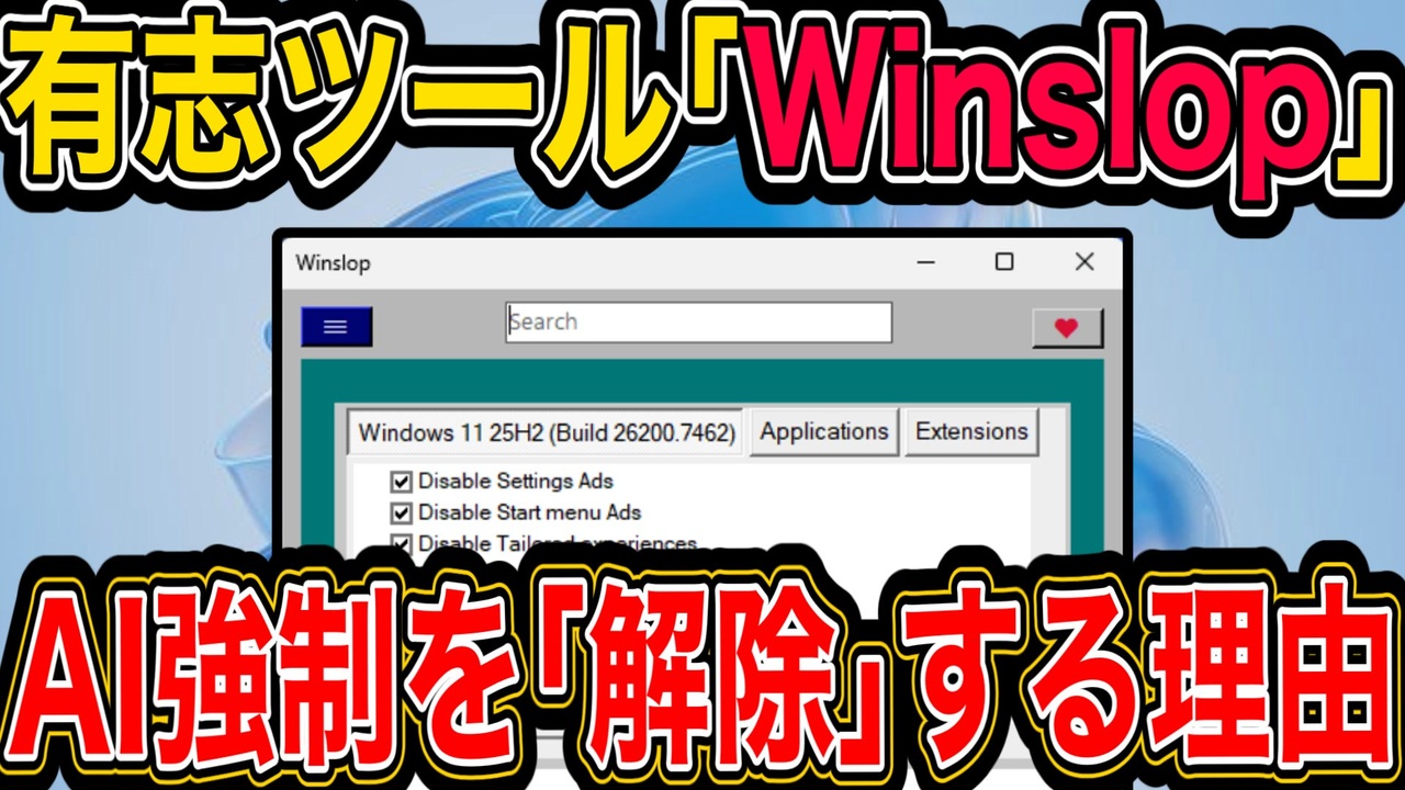 なぜ1600人が、見知らぬ開発者のツールを信じたのか?<br>公式より野良を選んだ理由がある。<br><br><br>【技術仕様と検証環境について】<br>本動画は、GitHubで公開されたオープンソースソフトウェアの技術的な仕組みと、その設計思想(ユーザー主権とプライバシー保護)に焦点を当てた解説コンテンツです。<br><br>動画内で紹介した動作は、撮影時点のソフトウェアバージョンおよび検証環境に基づくものです。<br>実機への導入など、システム設定の変更を伴う操作については、復元ポイントの作成やバックアップといった一般的なシステム管理手順を前提としています。<br><br>・Winslop (GitHub / Source Code)<br><a href="https://github.com/builtbybel/Winslop" target="_blank" rel="noopener nofollow">https://github.com/builtbybel/Winslop</a><br><br>・Reference Article (Neowin)<br><a href="https://www.neowin.net/news/new-tool-removes-ai-from-windows-11-and-gives-users-more-control-over-system/" target="_blank" rel="noopener nofollow">https://www.neowin.net/news/new-tool-removes-ai-from-windows-11-and-gives-users-more-control-over-system/</a><br><br><br><a href="https://youtu.be/M0frLG4pMWg" target="_blank" rel="noopener nofollow">https://youtu.be/M0frLG4pMWg</a><br><br><br>性能向上 関連動画まとめ<br><a href="https://www.youtube.com/playlist?list=PLiq-63CCkpXQZdrV9-IgPCfaEbHy5nvQ2" target="_blank" rel="noopener nofollow">https://www.youtube.com/playlist?list=PLiq-63CCkpXQZdrV9-IgPCfaEbHy5nvQ2</a><br><br>microsoft 関連動画まとめ<br><a href="https://www.youtube.com/playlist?list=PLiq-63CCkpXTqMQRU6LqAEkb21Z7Hh5j6" target="_blank" rel="noopener nofollow">https://www.youtube.com/playlist?list=PLiq-63CCkpXTqMQRU6LqAEkb21Z7Hh5j6</a><br><br><br>チャプター<br> <br>0:00 なぜ窓は開く?<br>0:17 「Slop」という名の宣言<br>1:32 6000人が認めた開発者<br>2:58 反AIではなく、反強制<br>4:21 美しさを捨てた設計<br>5:40 告白と矛盾<br>7:07 静かな窓<br> <br><br>#Windows11 #Winslop #Microsoft #システム管理 #最適化<br>