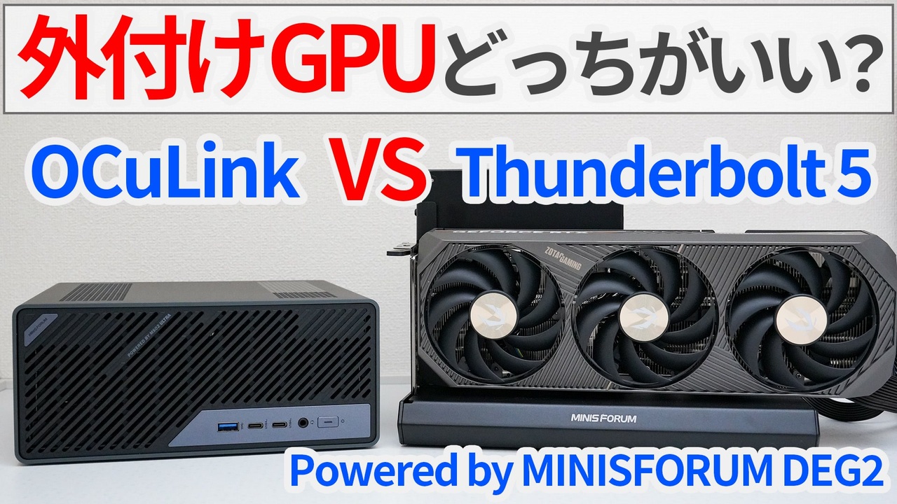 実験したいので欲しいですとお願いしたらいただけました。<br>MINISFORUMさんありがとうございます!!<br>(結果は想定していたものと大分違ったけど)<br><br>■今回登場した製品<br>「MINISFORUM DEG2」<br>Amazon:<a href="https://amzn.to/4sHrSKX" target="_blank" rel="noopener nofollow">https://amzn.to/4sHrSKX</a><br>公式ストア:<a href="https://www.minisforum.jp/products/minisforum-deg2?aff=280" target="_blank" rel="noopener nofollow">https://www.minisforum.jp/products/minisforum-deg2?aff=280</a><br><br>「MINISFORUM MS-02 Ultra」<br>レビュー動画:<a href="https://www.nicovideo.jp/watch/sm45736190" class="watch">sm45736190</a><br>Amazon:<a href="https://amzn.to/4pa7UWk" target="_blank" rel="noopener nofollow">https://amzn.to/4pa7UWk</a><br>公式ストア:<a href="https://www.minisforum.jp/products/ms-02-ultra?aff=280" target="_blank" rel="noopener nofollow">https://www.minisforum.jp/products/ms-02-ultra?aff=280</a><br><br>「ZOTAC GAMING GeForce RTX 5070 Ti SOLID SFF OC」<br>公式HP:<a href="https://www.zotac.com/jp/product/graphics_card/zotac-gaming-geforce-rtx-5070-ti-solid-sff-oc" target="_blank" rel="noopener nofollow">https://www.zotac.com/jp/product/graphics_card/zotac-gaming-geforce-rtx-5070-ti-solid-sff-oc</a><br><br>「ASUS GeForce RTX 5060 LP BRK 8GB GDDR7 OC Edition」<br>公式HP:<a href="https://www.asus.com/jp/motherboards-components/graphics-cards/asus/rtx5060-o8g-lp-brk/" target="_blank" rel="noopener nofollow">https://www.asus.com/jp/motherboards-components/graphics-cards/asus/rtx5060-o8g-lp-brk/</a><br><br>※上記リンクにはAmazonアソシエイツリンク・アフィリエイトリンクを使用しています<br><br>■Amazonアソシエイト<br><a href="https://amzn.to/489hn7K" target="_blank" rel="noopener nofollow">https://amzn.to/489hn7K</a><br>このリンクを通じてAmazonの日々の買い物をしていただくと、当チャンネルの活動の支えになります。もしよければご使用ください…!<br><br>■Twitter(新製品情報やPC関連のネタを投稿しています)<br><a href="https://twitter.com/midou_pcmovie?t=CswQClbF7dbVc44bT__4JA&s=09" target="_blank" rel="noopener nofollow">https://twitter.com/midou_pcmovie?t=CswQClbF7dbVc44bT__4JA&s=09</a><br><br>#ゆっくり解説 #ミニPC #外付けGPU