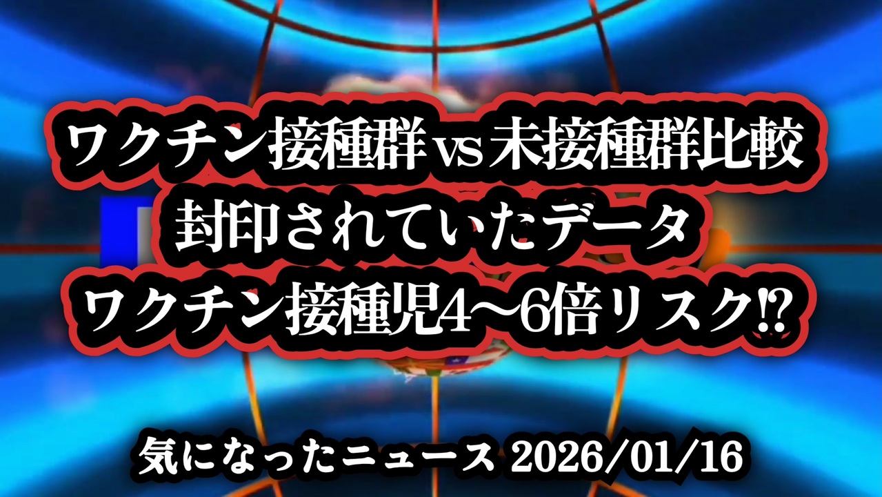 【ワクチン接種群 vs 未接種群比較】◆ワクチン接種児4〜6倍リスク?封印された内部データ◆上野厚労大臣、コロナワクチン2,300人の死亡報告リストは「見ていない」<br><br>あらすじ<br>米国の医療現場で実施された内部研究が、一本のドキュメンタリーによって表に出た。ワクチンを接種した子供と未接種の子供を比較すると、健康状態や慢性疾患の発症率に大きな差があるとされ、医療と科学の在り方が問われている。研究は公表されず封印されてきたが、その判断は透明性を欠いていたのではないかという疑念を生んだ。米国社会では今、子供の未来を守るため、科学的検証と正確な情報公開が強く求められている。<br><br>◆今回の台本&詳細<a href="https://keiichiro8140.hatenablog.com/entry/26011666333999" target="_blank" rel="noopener nofollow">https://keiichiro8140.hatenablog.com/entry/26011666333999</a><br><br>◆これまでの動画<a href="https://x.gd/sPXoJ" target="_blank" rel="noopener nofollow">https://x.gd/sPXoJ</a><br><br>◆もしも(BAN)の時のためのマイリンク集<a href="https://lit.link/K-16_News44" target="_blank" rel="noopener nofollow">https://lit.link/K-16_News44</a><br><br>ご覧いただきありがとうございます<br>m(_ _)m<br><br>気になったニュース 2026/01/16<br><br />著作権、肖像権に配慮して作成しております。<br><br>◆気になったニュースの台本!?<br>メモ代わりに作った台本をそのままあげてます<br><a href="https://keiichiro8140.hatenablog.com/." target="_blank" rel="noopener nofollow">https://keiichiro8140.hatenablog.com/.</a><br><br><br>ここからはシリーズ紹介<br><br><br>◆ ワクチン解毒・デトックス<br><a href="https://x.gd/fZweg" target="_blank" rel="noopener nofollow">https://x.gd/fZweg</a><br><br>◆ウイリアム・マキス博士のがん治療(イベルメクチン・フェンベンダゾール等)<br><a href="https://x.gd/AtFYS" target="_blank" rel="noopener nofollow">https://x.gd/AtFYS</a><br><br>◆予防接種健康被害救済制度<br><a href="https://x.gd/0xK9x" target="_blank" rel="noopener nofollow">https://x.gd/0xK9x</a><br><br>◆気になったニュース #1501~<br><br>◆ 【ショートver】気になったニュース<br><a href="https://x.gd/7MxXC" target="_blank" rel="noopener nofollow">https://x.gd/7MxXC</a><br><br>◆ 気になったニュース #1001~<br><a href="https://x.gd/Lp8gv" target="_blank" rel="noopener nofollow">https://x.gd/Lp8gv</a><br><br>◆ 気になったニュース #501~<br><a href="https://x.gd/EmbS4" target="_blank" rel="noopener nofollow">https://x.gd/EmbS4</a><br><br>◆ 気になったニュース #1~#500<br><a href="https://x.gd/uPhNb" target="_blank" rel="noopener nofollow">https://x.gd/uPhNb</a><br><br>◆ X(旧Twitter)・テレグラムで気になった情報<br><a href="https://x.gd/YG6FT" target="_blank" rel="noopener nofollow">https://x.gd/YG6FT</a><br><br>◆ 日比谷5万人パレードデ⚪生放送アーカイブ動画<br><a href="https://x.gd/3CHJv" target="_blank" rel="noopener nofollow">https://x.gd/3CHJv</a><br><br>◆日比谷5万人パレード⚪モのマイリスト作ってみました<br><a href="https://nico.ms/mylist/76828848?ref=sp_other" target="_blank" rel="noopener nofollow">https://nico.ms/mylist/76828848?ref=sp_other</a><br><br>◆3.30 令和の百姓⚪⚪<br><a href="https://www.nicovideo.jp/series/511791?ref=garage_share_other" target="_blank" rel="noopener nofollow">https://www.nicovideo.jp/series/511791?ref=garage_share_other</a><br><br>◆ 及川幸久さんの【XNEWS】シリーズ<br><a href="https://x.gd/3k78K" target="_blank" rel="noopener nofollow">https://x.gd/3k78K</a><br><br>◆これまでの動画<a href="https://x.gd/sPXoJ" target="_blank" rel="noopener nofollow">https://x.gd/sPXoJ</a><br><br>◆もしも(BAN)の時のためのマイリンク集<a href="https://lit.link/K-16_News44" target="_blank" rel="noopener nofollow">https://lit.link/K-16_News44</a><br><br>