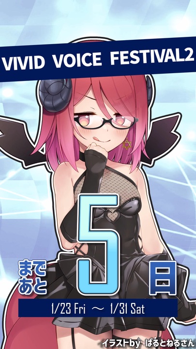 「VIVID VOICE FESTIVAL2」までのカウントダウン!<br>【1/23】の開催まであと5日だよ💜<br><br>■VIVID VOICE FESTIVAL2 開催期間<br>2026年1月23日(金)~1月31日(土)<br><br>■投稿祭の公式ページはこちら!<br><a href="https://site.nicovideo.jp/vividvoicefestival/" target="_blank" rel="noopener nofollow">https://site.nicovideo.jp/vividvoicefestival/</a><br><br>◆アルマちゃん@twitter<br><a href="https://twitter.com/arma_prg" target="_blank" rel="noopener nofollow">https://twitter.com/arma_prg</a><br><br>◆Lusty*Kiss Production 公式サイト<br><a href="https://production.lusty-kiss.com/" target="_blank" rel="noopener nofollow">https://production.lusty-kiss.com/</a><br><br>◆Lusty*Kiss Production YouTubeチャンネル<br><a href="https://www.youtube.com/channel/UCfxvv69Q0j0k2Rvm8x9vEhQ" target="_blank" rel="noopener nofollow">https://www.youtube.com/channel/UCfxvv69Q0j0k2Rvm8x9vEhQ</a><br><br>◆COEIROINK 公式サイト<br><a href="https://coeiroink.com/" target="_blank" rel="noopener nofollow">https://coeiroink.com/</a><br><br>------出演------<br>アルマちゃん:アルマちゃん@COEIROINK<br><a href="https://coeiroink.com/character/audio-character/arma-p" target="_blank" rel="noopener nofollow">https://coeiroink.com/character/audio-character/arma-p</a><br><br>------立ち絵------<br>アルマちゃん立ち絵素材(ぱるとねる 様)<br><a href="https://seiga.nicovideo.jp/seiga/im11721154" target="_blank" rel="noopener nofollow">https://seiga.nicovideo.jp/seiga/im11721154</a><br><br>------使用素材 ------<br>ディアちゃんの休日<br><a href="https://commons.nicovideo.jp/material/nc266496" target="_blank" rel="noopener nofollow">https://commons.nicovideo.jp/material/nc266496</a>