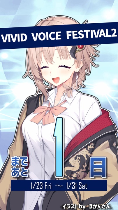 「VIVID VOICE FESTIVAL2」までのカウントダウン!<br>【1/23】の開催まであと1日だよ💜<br><br>■VIVID VOICE FESTIVAL2 開催期間<br>2026年1月23日(金)~1月31日(土)<br><br>■投稿祭の公式ページはこちら!<br><a href="https://site.nicovideo.jp/vividvoicefestival/" target="_blank" rel="noopener nofollow">https://site.nicovideo.jp/vividvoicefestival/</a><br><br>◆アルマちゃん@twitter<br><a href="https://twitter.com/arma_prg" target="_blank" rel="noopener nofollow">https://twitter.com/arma_prg</a><br><br>◆Lusty*Kiss Production 公式サイト<br><a href="https://production.lusty-kiss.com/" target="_blank" rel="noopener nofollow">https://production.lusty-kiss.com/</a><br><br>◆Lusty*Kiss Production YouTubeチャンネル<br><a href="https://www.youtube.com/channel/UCfxvv69Q0j0k2Rvm8x9vEhQ" target="_blank" rel="noopener nofollow">https://www.youtube.com/channel/UCfxvv69Q0j0k2Rvm8x9vEhQ</a><br><br>◆COEIROINK 公式サイト<br><a href="https://coeiroink.com/" target="_blank" rel="noopener nofollow">https://coeiroink.com/</a><br><br>------出演------<br>アメノちゃん:アメノちゃん@COEIROINK<br><a href="https://coeiroink.com/character/audio-character/ameno-h" target="_blank" rel="noopener nofollow">https://coeiroink.com/character/audio-character/ameno-h</a><br><br>------立ち絵------<br>アメノちゃん立ち絵素材(ほかん 様)<br><a href="https://seiga.nicovideo.jp/seiga/im11730933" target="_blank" rel="noopener nofollow">https://seiga.nicovideo.jp/seiga/im11730933</a><br><br>------使用素材 ------<br>ディアちゃんの休日<br><a href="https://commons.nicovideo.jp/material/nc266496" target="_blank" rel="noopener nofollow">https://commons.nicovideo.jp/material/nc266496</a>