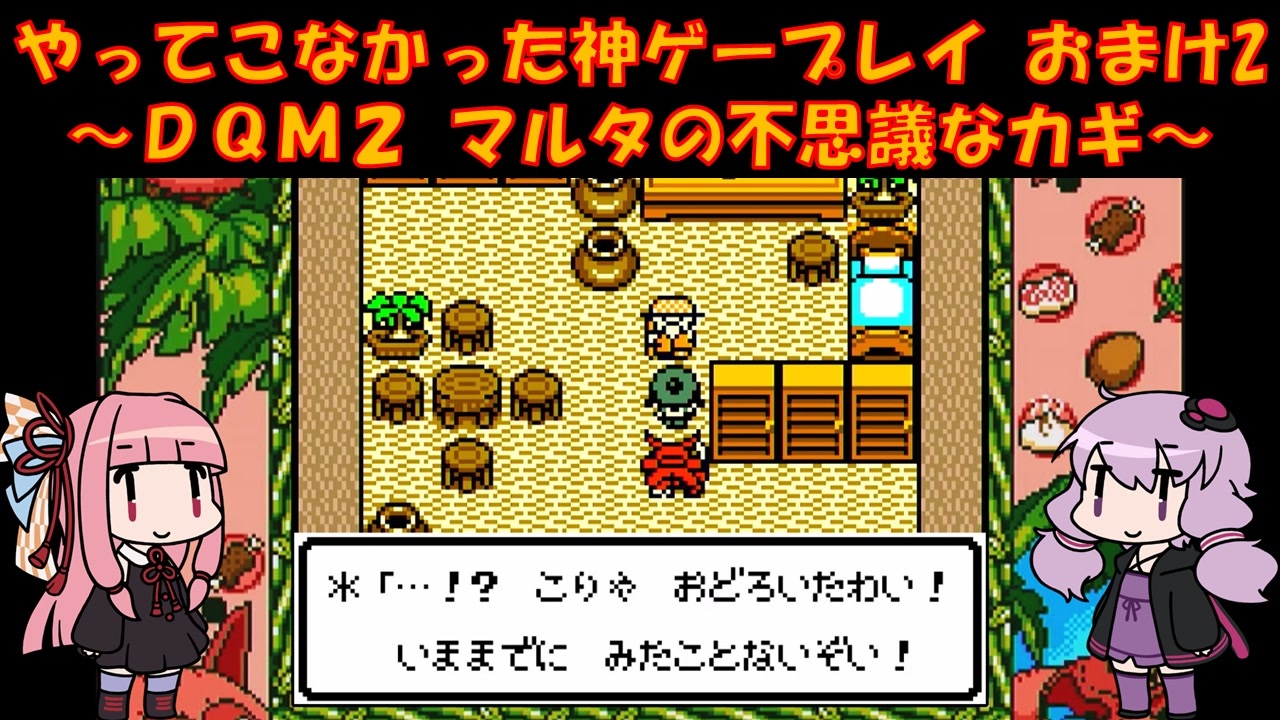 GBC ドラゴンクエストモンスターズ2 マルタの不思議なカギをプレイ<br>ゆかりさんはメジャーじゃないゲームをやる俺カッケー族だったのでドラクエをやったことがありませんでした(DSのⅤ以外)<br><br>ゆ:なあなぁどんな気持ち?<br> コレクター自らがコレクションになった気持ちは<br>茜:ドークくん顔真っ赤になりそう<br><br>PART1:<a href="https://www.nicovideo.jp/watch/sm45684209" target="_blank" rel="noopener nofollow">https://www.nicovideo.jp/watch/sm45684209</a><br><br>各DQシリーズ再生リスト<br><a href="https://garage.nicovideo.jp/niconico-garage/video/series/390298" target="_blank" rel="noopener nofollow">https://garage.nicovideo.jp/niconico-garage/video/series/390298</a><br><br><br>動画内で使用させていただいた素材<br>【イラスト】<br>結月ゆかり→山栗鼠様:<a href="https://seiga.nicovideo.jp/seiga/im5354179" target="_blank" rel="noopener nofollow">https://seiga.nicovideo.jp/seiga/im5354179</a><br>琴葉茜→山栗鼠様:<a href="https://seiga.nicovideo.jp/seiga/im5342445" target="_blank" rel="noopener nofollow">https://seiga.nicovideo.jp/seiga/im5342445</a><br><br>【音声】<br>A.I.Voice:琴葉茜<br><a href="https://aivoice.jp/product/kotonoha/" target="_blank" rel="noopener nofollow">https://aivoice.jp/product/kotonoha/</a><br><br>A.I.Voice:結月ゆかり<br><a href="https://aivoice.jp/product/yukari/" target="_blank" rel="noopener nofollow">https://aivoice.jp/product/yukari/</a><br><br>この動画で利用している株式会社スクウェア・エニックスを代表とする共同著作者が権利を所有する著作物及びスギヤマ工房有限会社が権利を所有する楽曲の転載・配布は禁止いたします。<br>© ARMOR PROJECT/BIRD STUDIO/SQUARE ENIX All Rights Reserved.<br>© SUGIYAMA KOBO