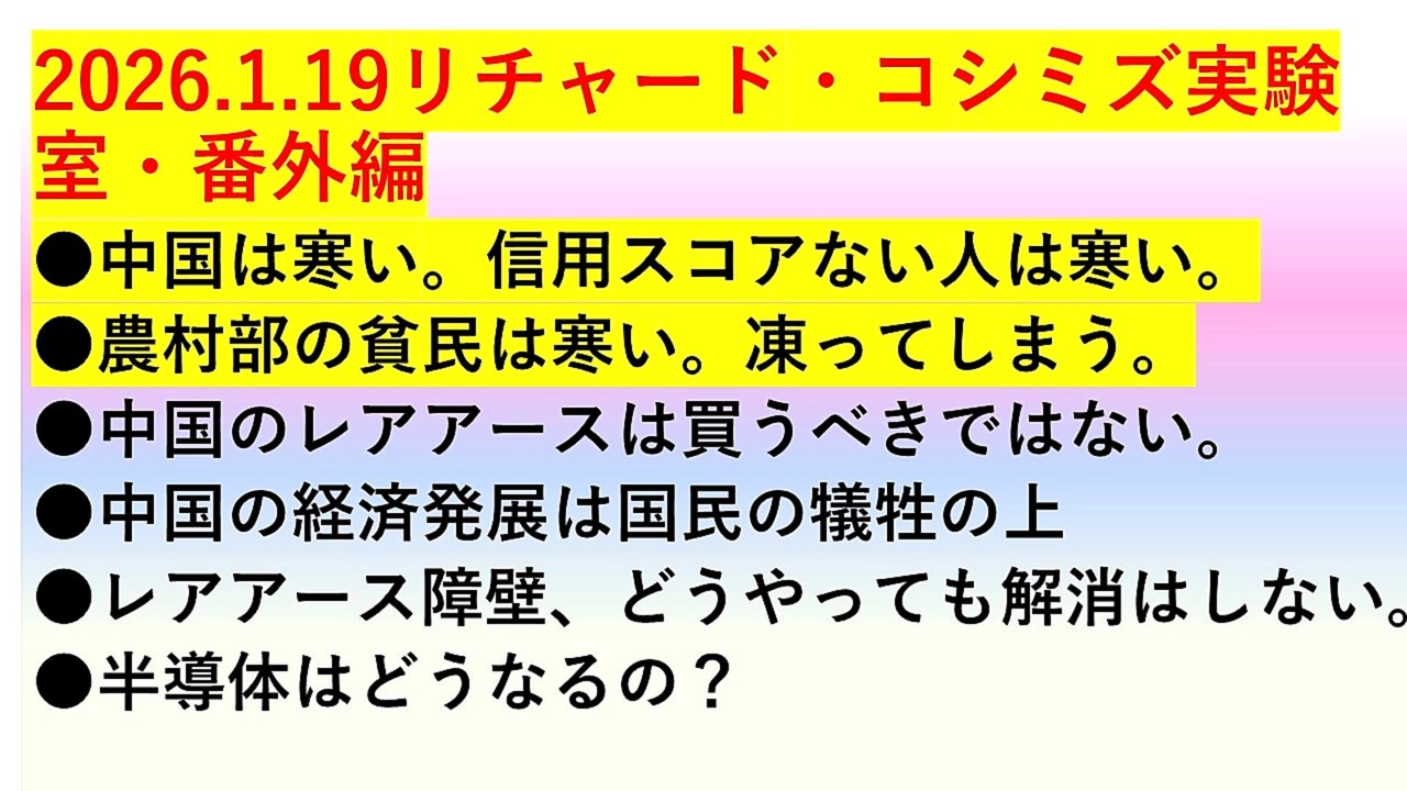 <span style="color: #cc0000;"><strong>◐『「 リチャード・コシミズ 実験室 」⦅ 番外編 ⦆①⦅ 改良版 ⦆』</strong></span><br><br> <span style="color: #ff0000;"><strong>◐『 中国 』は『 寒い 』。『 信用スコア 』がない人は『 寒い 』。◐『 農村部 』の『 貧民 』は『 寒い 』。『 凍ってしまう 』。<br><br> ◐『 中国 』の『 レアアース 』は『 買うべきではない 』。◐『 中国 』の『 経済発展 』は『 国民 』の『 犠牲 』の上。<br><br> ◐『 レアアース障壁 』、どうやっても『 解消 』はしない。◐『 半導体 』はどうなるの?</strong></span><br><br> <span style="color: #38761d;"><strong>◐『 リチャード・コシミズ・チャンネル</strong></span><span style="color: #ff0000;"><strong>⦅ ニコニコ チャンネル ⦆</strong></span><span style="color: #38761d;"><strong>』</strong></span><br> <span style="color: #0000ff;"><strong><a href="https://ch.nicovideo.jp/richardkoshimizu" target="_blank" rel="noopener nofollow">https://ch.nicovideo.jp/richardkoshimizu</a></strong></span><br><br> <span style="color: #38761d;"><strong>◐『「 リチャード・コシミズ 講演会 」</strong></span><span style="color: #ff0000;"><strong>公式「 動画ギャラリー 」⦅ 最新動画 ⦆⦅ YouTube版 ⦆</strong></span><span style="color: #38761d;"><strong>』</strong></span><br> <span style="color: #0000ff;"><strong> <a href="https://www.youtube.com/@richardkoshimizu-video-gallery" target="_blank" rel="noopener nofollow">https://www.youtube.com/@richardkoshimizu-video-gallery</a></strong></span><br>