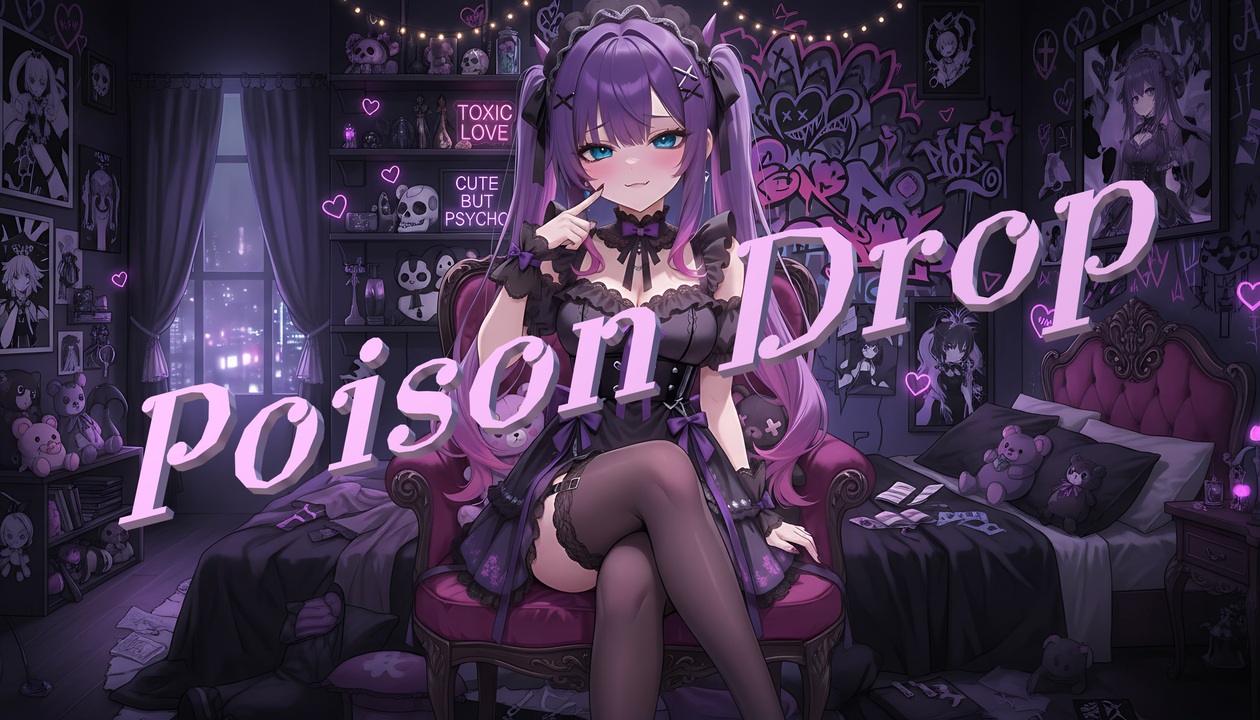 ☆皆様おはこんにばんわ☆ yukarikoです(*・ ・*)<br><br>この度は、ご視聴ありがとうございます。<br>※今回 病み系の歌の為、苦手な方はブラウザバック推奨です※<br><br>その雫は甘いけど猛毒。。<br>地雷系キャラになりつつ、曲は一部ノイジーな雰囲気にしてみました。<br><br><br>-lyrics-<br><br>髪解いて ベッドの上で転がって<br>画面越しにキミのアイコン 点滅してんの見てるだけ<br><br>「かわいいね」って打って消して また打って消して<br>今日も 心が1gずつ溶けていく<br>通知音が鳴る度 体が勝手に震えるの<br>君が 他の子にリプ飛ばしてるの見ると<br>指先が冷たくなって 涙より先に血が欲しくなる<br><br>ねぇ…? 少しだけ<br>私の事 ちゃんと見ててよ…?<br>見ててくれなきゃ…壊しちゃう<br><br>Poison Drop<br><br>ねぇ私を 愛してると言ってよ<br>ウソでも良いから 抱き潰してよ<br>私の心が 濁る前に キミの手で 抉って 埋めて<br>私の地雷踏んでも良いよ 踏み抜いても良いよ<br>爆発する心臓 君に全部見せてあげる<br><br>「好き」って叫ぶ声が 歪んでechoして<br>この世界の中だけは 私だけの物だよ<br>また「block」 繰り返す闇<br>鏡の中の私 今日もちょっと死んでる<br><br>でも君が「可愛い」って言ってくれれば<br>生き返れるの だからお願い<br>何回でも言って 何回でも騙して<br><br>薬の味がまだ口の中に残ってる<br>君の名前を舌の上で転がすと<br>ちょっとだけ甘くなるの…不思議<br><br>(Poison Drop)<br><br>もう 我慢できない…<br>キミの心臓 私に頂戴 私を満足させてよ<br><br>優しい嘘より 刃の方が欲しい<br>私の心が 砕ける前に<br>キミの手で 全部壊して頂戴<br><br>地雷なんていくつでも 仕掛けてあげる<br>踏んだら爆発 踏まなかったら自爆<br>どっちでも良いよ 君の最後の時まで<br>私の名前 叫んでくれれば…<br><br>…ねぇ …消えないで?<br>…ねぇ …私のことだけみて?<br>…他の子なんか見ないで?<br>…見たら…ホントに…潰すから…<br><br>ねぇ私を 愛してると言ってよ<br>ウソでも良いから 抱き潰してよ<br>ウソでも良い 私の最後の時まで<br>キミの声で 私を 愛して<br><br>Poison Drop<br><br><br>yukarikoの他の動画はコチラ→<a href="https://www.nicovideo.jp/mylist/67902877" target="_blank" rel="noopener">mylist/67902877</a><br><br><span style="color: #ff0000;">※※無断転載禁止です※※</span>