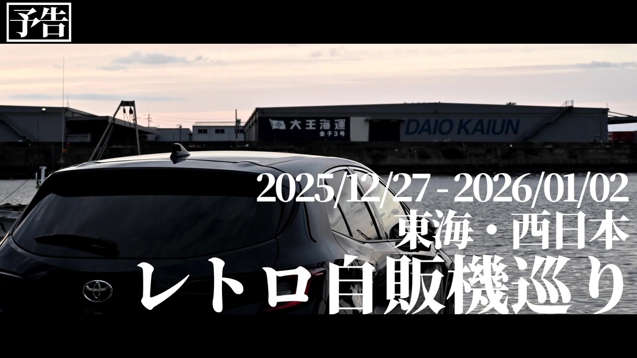 予告動画は初投稿です。<br>年末年始、西日本方面のレトロ自販機巡りをしてきました。<br>今回は試験的に予告・ダイジェストのような形をとってみました。<br>本編は……気長にお待ちください。<br><br>◆使用した音声:<br>VOICEROID2:紲星あかり<br><br>◆使用立ち絵:<br>紲星あかり<br>konnyakuさん <a href="https://seiga.nicovideo.jp/seiga/im8106524" target="_blank" rel="noopener">im8106524</a><br>京町セイカ<br>夜刀さん <a href="https://seiga.nicovideo.jp/seiga/im10664911" target="_blank" rel="noopener">im10664911</a><br>結月ゆかり&東北きりたん<br>まっくさん <a href="https://seiga.nicovideo.jp/seiga/im11467257" target="_blank" rel="noopener">im11467257</a><br>花隈千冬<br>ぴぴさん <a href="https://seiga.nicovideo.jp/seiga/im11546150" target="_blank" rel="noopener">im11546150</a><br>小春六花<br>MtUさん <a href="https://seiga.nicovideo.jp/seiga/im11158385" target="_blank" rel="noopener">im11158385</a><br>夏色花梨<br>ケースケさん <a href="https://seiga.nicovideo.jp/seiga/im11629858" target="_blank" rel="noopener">im11629858</a><br>???<br>ユメのオワリさん <a href="https://seiga.nicovideo.jp/seiga/im11367930" target="_blank" rel="noopener">im11367930</a><br><br>◆使用した楽曲:<br>The Gong of Knockout / Fear, and Loathing in Las Vegas<br><br>◆投稿者のTwitter:<br><a href="https://x.com/weakest_fish" target="_blank" rel="noopener nofollow">https://x.com/weakest_fish</a> (メインアカウント)<br><a href="https://x.com/wf_watermelon" target="_blank" rel="noopener nofollow">https://x.com/wf_watermelon</a> (???)