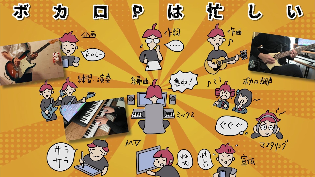 こんにちはミキヲトです!<br><br><span style="color: #cc0000; font-size: 16px;"><strong>ボカロP生活 2周年の記念作品となりました<br>いいね&マイリスいただけると嬉しいです!(´ω`*)</strong></span><br><br>2025年11月リリース「ボカロPは忙しい(90s Version)」をフルアレンジして「弾いてみた」動画として公開しました<br><br>新規収録の生演奏に、ボカロP&歌い手さん総勢7名の大合唱!<br><br>●音楽と絵と動画|ミキヲト(+ベースとピアノ演奏とフェイク少々)<br><a href="https://twitter.com/mikiwoto" target="_blank" rel="noopener nofollow">https://twitter.com/mikiwoto</a><br><br>●歌唱|京町セイカ(+コーラス Jin・GUMI)<br><br>●ギター演奏&コーラス|てくて <br><a href="https://x.com/teqtechs" target="_blank" rel="noopener nofollow">https://x.com/teqtechs</a><br>●コーラス|たなすけ* <br><a href="https://x.com/TanaSukeBee" target="_blank" rel="noopener nofollow">https://x.com/TanaSukeBee</a><br>●コーラス|たなすこ* <br><a href="https://x.com/TanaSukeBee" target="_blank" rel="noopener nofollow">https://x.com/TanaSukeBee</a><br>●コーラス|果実園の布 <br><a href="https://x.com/kajituennonuno" target="_blank" rel="noopener nofollow">https://x.com/kajituennonuno</a><br>●コーラス|MiO <br><a href="https://x.com/Owlmy1412" target="_blank" rel="noopener nofollow">https://x.com/Owlmy1412</a><br>●コーラス|hana <br><a href="https://x.com/aoharu202304" target="_blank" rel="noopener nofollow">https://x.com/aoharu202304</a><br>●作詞協力|ゆきま2り <br><a href="https://x.com/yukima2ri" target="_blank" rel="noopener nofollow">https://x.com/yukima2ri</a><br><br>●X(Twitter)<br><a href="https://twitter.com/mikiwoto" target="_blank" rel="noopener nofollow">https://twitter.com/mikiwoto</a><br><br>●YouTube<br><a href="https://www.youtube.com/@mikiwoto" target="_blank" rel="noopener nofollow">https://www.youtube.com/@mikiwoto</a><br><br>●ニコニコ動画<br><a href="https://www.nicovideo.jp/mylist/76374320" target="_blank" rel="noopener nofollow">https://www.nicovideo.jp/mylist/76374320</a><br><br><歌詞><br>いまさらの話だけど ボカロPは忙しい<br>作詞・作曲・編曲・調声・イラスト・動画まで<br><br>バージョンアップが来た (DAW)<br>マニュアル読まなきゃ (バグだらけ?)<br>流行りのプラグイン (みんな持ってる)<br>お金がいくらあっても足りないし<br>ボカロPは大変だ<br><br>それなのにやめられない やめたくないボカロP<br>苦労して作った作品 一生僕の宝<br><br>浮んでは消えてく(メロディ)<br>歌詞も書かなきゃ(ネタがない)<br>アイデアひねり出す(いつもスランプ)<br>それでも投稿祭迫ってる<br>ボカロPは大変だ<br><br>それなのにやめられない やめたくないボカロP<br>苦労して作った作品 一生僕の宝<br><br>君にも届くといいな