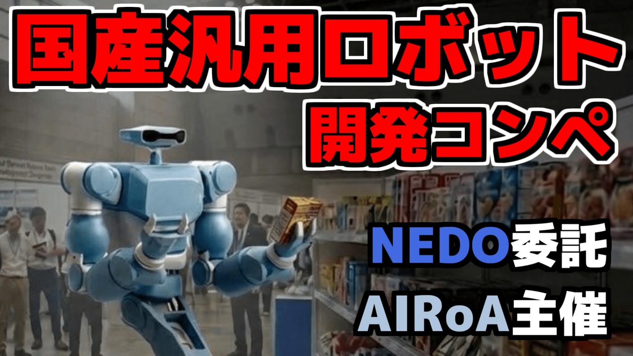 開催は2026年9月予定!めちゃ楽しみやねんな~<br><br>・AIRoA - 国産汎用ロボット開発コンペティション」の公募について(予告)<br><a href="https://www.airoa.org/ja/updates/20251209" target="_blank" rel="noopener nofollow">https://www.airoa.org/ja/updates/20251209</a><br><br>動画製作にあたり下記プレスリリースを大変参考にさせていただきました。<br>・PR TIMES - 国産汎用ロボット開発コンペティションプレエントリー受付開始<br><a href="https://prtimes.jp/main/html/rd/p/000000008.000158322.html" target="_blank" rel="noopener nofollow">https://prtimes.jp/main/html/rd/p/000000008.000158322.html</a><br><br>・ロボスタ - AIロボット協会(AIRoA)「国産汎用ロボット開発コンペティション」プレエントリー受付開始、NEDO委託事業<br><a href="https://robotstart.info/article/2025/12/19/381512.html" target="_blank" rel="noopener nofollow">https://robotstart.info/article/2025/12/19/381512.html</a><br><br><br>~~~~~~~~~~~~~~~~~~~~~~~~~~~~~~<br><br>よろしければ高評価、チャンネル登録よろしくお願いいたします!<br><br>・ツイッターやっておりますフォローいただけるとめちゃうれしいです!<br>Twitter : <a href="https://twitter.com/roughrobotics" target="_blank" rel="noopener nofollow">https://twitter.com/roughrobotics</a><br><br>・読み上げにはVOICEVOXを使わせていただいております。<br>VOICEVOX:ずんだもん<br><br>・下記素材を使わせていただいております。<br>ゆっくりずんだもん素材(作者:ヒザフライ様)<br><a href="https://seiga.nicovideo.jp/seiga/im11149817" target="_blank" rel="noopener nofollow">https://seiga.nicovideo.jp/seiga/im11149817</a><br>素敵なgif画像各種(作者:Who inside様)<br><a href="https://seiga.nicovideo.jp/user/illust/3396814" target="_blank" rel="noopener nofollow">https://seiga.nicovideo.jp/user/illust/3396814</a><br><br>・動画や配信の音源には下記サイト様のものを使わせていただいております<br>DOVA-SYNDROME(<a href="https://dova-s.jp/_contents/about/)" target="_blank" rel="noopener nofollow">https://dova-s.jp/_contents/about/)</a><br>魔王魂(<a href="https://maou.audio/game_battle35/)" target="_blank" rel="noopener nofollow">https://maou.audio/game_battle35/)</a><br>OtoLogic(<a href="https://otologic.jp/free/license.html)" target="_blank" rel="noopener nofollow">https://otologic.jp/free/license.html)</a><br>MusMus(<a href="https://musmus.main.jp/info.html)" target="_blank" rel="noopener nofollow">https://musmus.main.jp/info.html)</a><br><br>AmazonやAliexpressのリンクはアマゾンアソシエイトリンク(広告)を使用しています