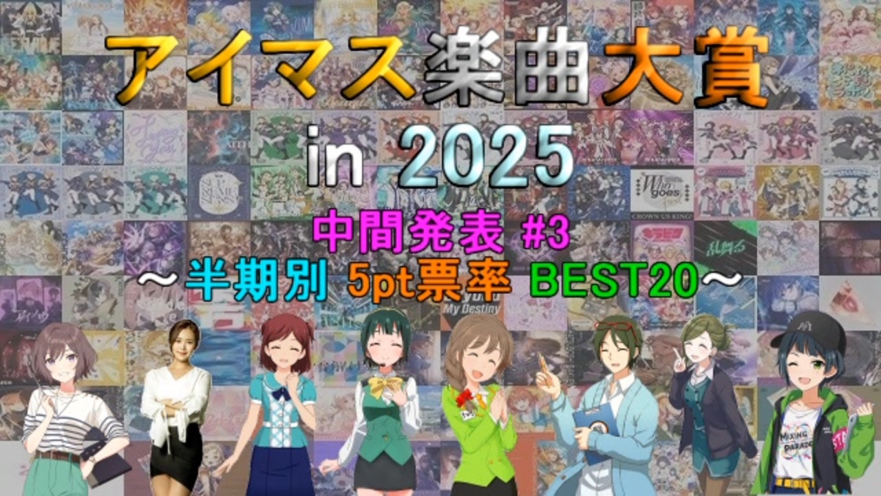<span style="color: #ff0000;"><strong>2025年にFull音源版が発売 or 配信</strong></span>されたアイマス関連の楽曲<br>(<span style="color: #0000ff;"><strong>計159曲</strong></span>)に対する人気投票企画の中間発表3回目です。<br>参加者<span style="color: #00ff00;"><strong>1800名</strong></span>の時点の結果から、<span style="color: #980000;"><strong>各楽曲における5pt票率</strong></span>を<br><span style="color: #f1c232;"><strong>半期別に上位20曲</strong></span>ご紹介します。<br><br>※<span style="color: #9900ff;"><strong>5pt票率</strong></span>=<span style="color: #ff00ff;"><strong>各楽曲の獲得5pt票数</strong></span>÷<span style="color: #00ffff;"><strong>各楽曲の獲得総票数</strong></span><br>※集計時点の<span style="color: #38761d;"><strong>5pt票率の数値は諸事情により非公開</strong></span>にしています。<br><br><span style="font-size: 24px;"><strong>☆投票期間終了しました</strong></span><br><br>○告知動画:<a href="https://www.nicovideo.jp/watch/sm45789010" class="watch">sm45789010</a><br>○中間2回目(楽曲別 分野順位一覧):<a href="https://www.nicovideo.jp/watch/sm45835611" class="watch">sm45835611</a><br><br>●「アイマス楽曲大賞 最終結果まとめ」:<a href="https://www.nicovideo.jp/mylist/70533939" target="_blank" rel="noopener">mylist/70533939</a><br>●『アイマス楽曲ランキングシリーズ』:<a href="https://www.nicovideo.jp/mylist/57911966" target="_blank" rel="noopener">mylist/57911966</a><br>●『THE IDOLM@STER Song Collection』:<a href="https://www.nicovideo.jp/mylist/61493969" target="_blank" rel="noopener">mylist/61493969</a><br>