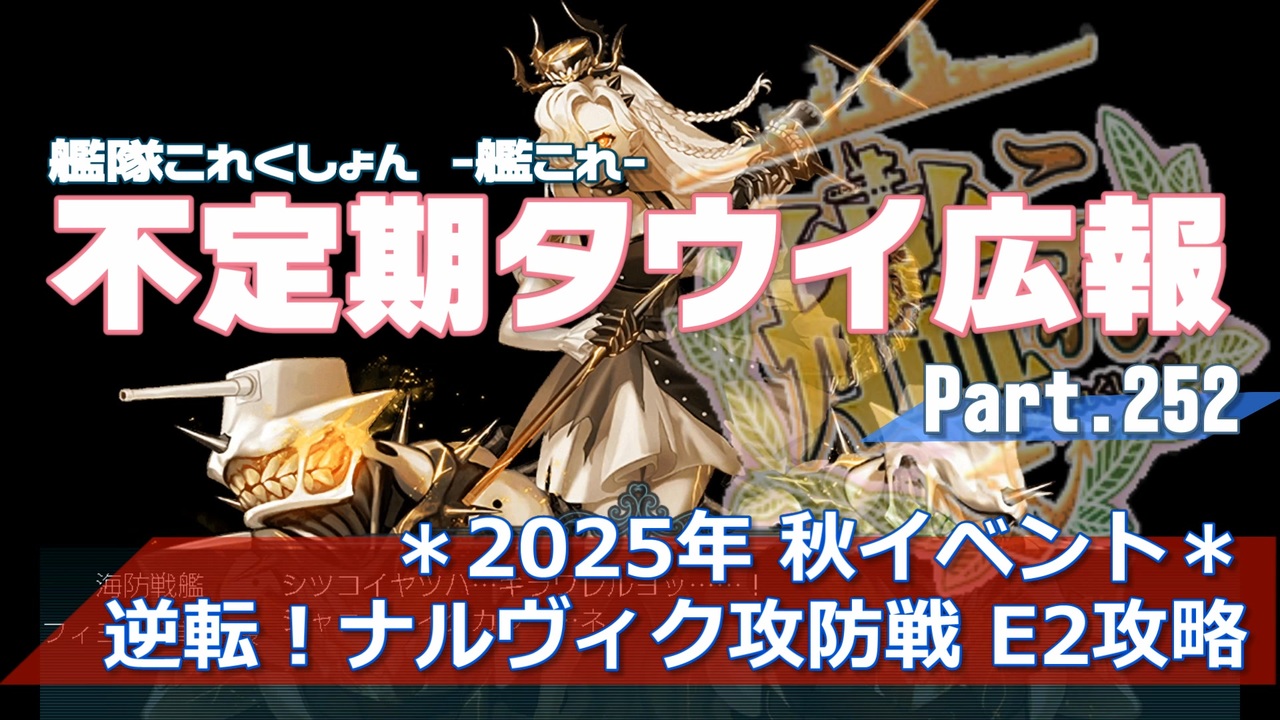 E2動画になります。<br>思ったよりサクッといけてしまってるんですが、個人的には結構大変だったんですよね。<br>燃料が10万を超えました。ボーキサイトはやっと自然回復超えました。バケツは…<br><br>前回動画(Pt.251)を風烈丸様、yui@柱島様、shu様、コパール様、indy (indjpn)様、弓永ナオ様、叢雲提督様、サルトル様、高町提督様、たぬきうどん様、りゅーせい様、ヒロ様、弥彦様、六頁管理人様、六本線様、貨物好き4075(eR)様、Krytron様、Habaki様、やはざま様、ケケレ区民様、矢咲カホル様、AKINO様、伊野様、kk様、who様、ゆう様、おさしみ様、湯月様、K-Saku様、あらはばき様、宵桜(ヨイザクラ)様、にゅにゅ様、jo様、<(゜∀。)様、ゆーきゅー様、TK@幌筵様、柳川様、totokaka様、三流提督様、さいぞう様、ガッツ様、あじ様、ATTI様、ヴォイテク様、アル様、Yotaka様から広告いただきました。<br>ありがとうございます!<br><br>前:Part251> <a href="https://www.nicovideo.jp/watch/sm45825173" class="watch">sm45825173</a> 次:Part253> <a href="https://www.nicovideo.jp/watch/sm45908660" class="watch">sm45908660</a><br><br>みちしおせんせい動画一覧:<a href="https://www.nicovideo.jp/mylist/63943551" target="_blank" rel="noopener">mylist/63943551</a><br>動画一覧:<a href="https://www.nicovideo.jp/mylist/45380440" target="_blank" rel="noopener">mylist/45380440</a><br>X:<a href="https://twitter.com/nekomaruta_tawi" target="_blank" rel="noopener nofollow">https://twitter.com/nekomaruta_tawi</a>