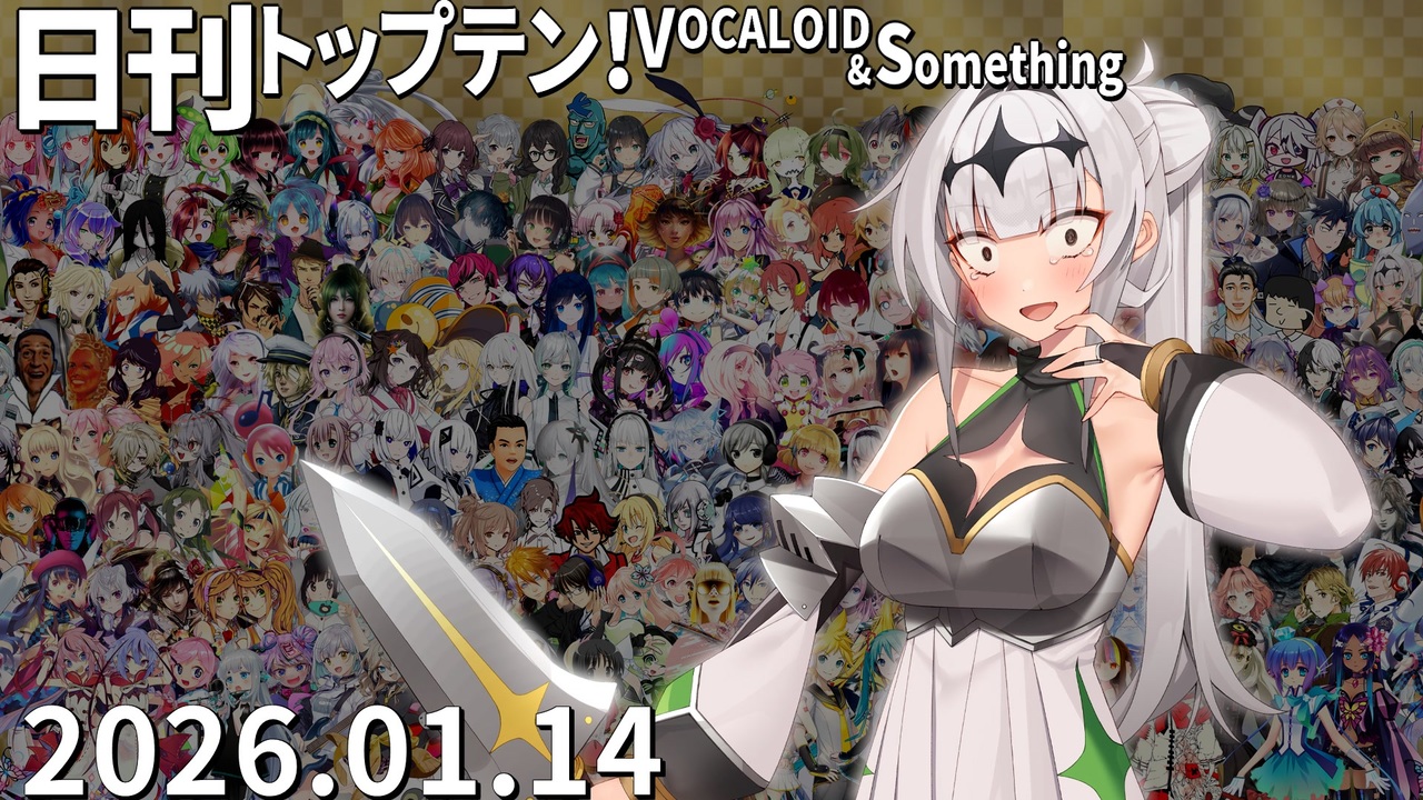 前日(1/13)←<a href="https://www.nicovideo.jp/watch/sm45877557" class="watch">sm45877557</a> <a href="https://www.nicovideo.jp/watch/sm45904718" class="watch">sm45904718</a>→翌日(1/15)<br>★「kiite」のプレイリストも見てね!<a href="https://kiite.jp/user/AIST_playlist_bot" target="_blank" rel="noopener nofollow">https://kiite.jp/user/AIST_playlist_bot</a><br>★チャプター<br>昨日1位<a href="#" class="seekTime" data-seekTime="0:00" onclick="seekNicoPlayer('#0:00'); return false;">#0:00</a> TOP10<a href="#" class="seekTime" data-seekTime="0:36" onclick="seekNicoPlayer('#0:36'); return false;">#0:36</a> 1年前<a href="#" class="seekTime" data-seekTime="2:56" onclick="seekNicoPlayer('#2:56'); return false;">#2:56</a> TOP3<a href="#" class="seekTime" data-seekTime="3:24" onclick="seekNicoPlayer('#3:24'); return false;">#3:24</a> 10年前<a href="#" class="seekTime" data-seekTime="4:55" onclick="seekNicoPlayer('#4:55'); return false;">#4:55</a> PICKUP<a href="#" class="seekTime" data-seekTime="5:23" onclick="seekNicoPlayer('#5:23'); return false;">#5:23</a> <br><br>★トップテン<br>10:<a href="https://www.nicovideo.jp/watch/sm45798896" class="watch">sm45798896</a> 9:<a href="https://www.nicovideo.jp/watch/sm45824688" class="watch">sm45824688</a> 8:<a href="https://www.nicovideo.jp/watch/sm45818987" class="watch">sm45818987</a> 7:<a href="https://www.nicovideo.jp/watch/sm45798413" class="watch">sm45798413</a> <br>6:<a href="https://www.nicovideo.jp/watch/sm45817213" class="watch">sm45817213</a> 5:<a href="https://www.nicovideo.jp/watch/sm45826031" class="watch">sm45826031</a> 4:<a href="https://www.nicovideo.jp/watch/sm45830910" class="watch">sm45830910</a> 3:<a href="https://www.nicovideo.jp/watch/sm45816339" class="watch">sm45816339</a> 2:<a href="https://www.nicovideo.jp/watch/sm45808883" class="watch">sm45808883</a> 1:<a href="https://www.nicovideo.jp/watch/sm45819883" class="watch">sm45819883</a> <br><br>★ピックアップ(B~Hは超新着枠)<br>B:<a href="https://www.nicovideo.jp/watch/sm45831159" class="watch">sm45831159</a> C:<a href="https://www.nicovideo.jp/watch/sm45832034" class="watch">sm45832034</a> D:<a href="https://www.nicovideo.jp/watch/sm45819362" class="watch">sm45819362</a> E:<a href="https://www.nicovideo.jp/watch/sm45829919" class="watch">sm45829919</a> F:<a href="https://www.nicovideo.jp/watch/sm45793589" class="watch">sm45793589</a> G:<a href="https://www.nicovideo.jp/watch/sm45828985" class="watch">sm45828985</a> <br>H:<a href="https://www.nicovideo.jp/watch/sm45807633" class="watch">sm45807633</a> I:<a href="https://www.nicovideo.jp/watch/sm45820325" class="watch">sm45820325</a> J:<a href="https://www.nicovideo.jp/watch/sm45825029" class="watch">sm45825029</a> K:<a href="https://www.nicovideo.jp/watch/sm45828730" class="watch">sm45828730</a> L:<a href="https://www.nicovideo.jp/watch/sm45822718" class="watch">sm45822718</a> M:<a href="https://www.nicovideo.jp/watch/sm45802816" class="watch">sm45802816</a> <br><br>★プレイバック <br>A(1年前):<a href="https://www.nicovideo.jp/watch/sm44538904" class="watch">sm44538904</a> 十(10年前):<a href="https://www.nicovideo.jp/watch/sm28006811" class="watch">sm28006811</a> 前日の第1位: <a href="https://www.nicovideo.jp/watch/sm45826942" class="watch">sm45826942</a>(クロワちゃん)<br><br>☆集計対象:2026/1/7~14 5時投稿の作品(1/14 5時集計)<br>★計算式:再生×1+コメント×最大12+いいね!×14+マイリスト×12<br>☆プレイリスト:<u><a href="https://nikkantop10.hatenablog.com/entry/ar20260114" target="_blank" rel="noopener nofollow">https://nikkantop10.hatenablog.com/entry/ar20260114</a></u> 、 <a href="https://www.nicovideo.jp/mylist/49271984" target="_blank" rel="noopener">mylist/49271984</a> <br>★1年前トップテン:<a href="https://www.nicovideo.jp/watch/sm44543737" class="watch">sm44543737</a><br />★日刊トップテン動画一覧マイリスト:<a href="https://www.nicovideo.jp/mylist/47849908" target="_blank" rel="noopener">mylist/47849908</a><br>☆ルールや計算式の詳細:<a href="https://nikkantop10-sub.hatenablog.com/entry/top10_rule" target="_blank" rel="noopener nofollow">https://nikkantop10-sub.hatenablog.com/entry/top10_rule</a><br><span style="color: #262626;">★K!!te Playlist LINK!:<a href="https://kiite.jp/user/AIST_playlist_bot" target="_blank" rel="noopener nofollow">https://kiite.jp/user/AIST_playlist_bot</a><br>☆Twitter:<a href="https://twitter.com/VOCALO_NEWRANK" target="_blank" rel="noopener nofollow">https://twitter.com/VOCALO_NEWRANK</a><br>★Thread:<a href="https://www.threads.net/@lukanan_p" target="_blank" rel="noopener nofollow">https://www.threads.net/@lukanan_p</a></span><br><br><span style="color: #0000ff;"><strong>◆今後の動画投稿イベント情報</strong></span><br><strong>2026/2/14 バレンタイン告白大作戦投稿祭</strong><br><a href="https://twipla.jp/events/667678" target="_blank" rel="noopener nofollow">https://twipla.jp/events/667678</a> ※「広義ボカロ」も参加可能 MVへのキャラ使用等は条件を要確認<br><strong>2026/2/19~23 The VOCALOID Collection 2026 Winter</strong> ※ニコニコ主催<br><a href="https://vocaloid-collection.jp/" target="_blank" rel="noopener nofollow">https://vocaloid-collection.jp/</a>