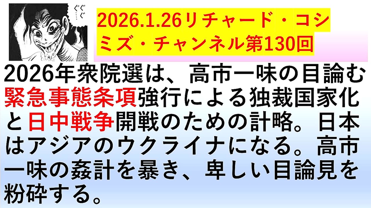 <span style="color: #cc0000;"><strong>◐『「 リチャード・コシミズ・チャンネル 」⦅ 第130回放送 ⦆⦅ 改良版 ⦆』</strong></span><br><br> <span style="color: #ff0000;"><strong>「『 2026年衆院選 』は、『 高市早苗 一味 』の目論む『 緊急事態条項 強行 』による『 独裁国家化 』と『 日中戦争 開戦 』のための『 計略 』。<br> 『 日本 』は『 アジア 』の『 ウクライナ 』になる。『 高市早苗 一味 』の『 姦計 』を『 暴き 』、卑しい『 目論見 』を『 粉砕 』する 」</strong></span><br><br> <span style="color: #38761d;"><strong>◐『 リチャード・コシミズ・チャンネル</strong></span><span style="color: #ff0000;"><strong>⦅ ニコニコ チャンネル ⦆</strong></span><span style="color: #38761d;"><strong>』</strong></span><br> <span style="color: #0000ff;"><strong><a href="https://ch.nicovideo.jp/richardkoshimizu" target="_blank" rel="noopener nofollow">https://ch.nicovideo.jp/richardkoshimizu</a></strong></span><br><br> <span style="color: #38761d;"><strong>◐『「 リチャード・コシミズ 講演会 」</strong></span><span style="color: #ff0000;"><strong>公式「 動画ギャラリー 」⦅ 最新動画 ⦆⦅ YouTube版 ⦆</strong></span><span style="color: #38761d;"><strong>』</strong></span><br> <span style="color: #0000ff;"><strong> <a href="https://www.youtube.com/@richardkoshimizu-video-gallery" target="_blank" rel="noopener nofollow">https://www.youtube.com/@richardkoshimizu-video-gallery</a></strong></span><br>