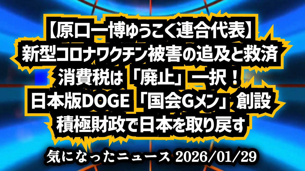 ◆原口一博ゆうこく連合代表『新型コロナワクチン被害の追及と救済、消費税は「廃止」一択!、日本版DOGE「国会Gメン」創設、積極財政で日本を取り戻す』<br><br>あらすじ<br>『ゆうこく連合』は、反グローバリズムを掲げ、新型コロナワクチン被害救済と真相究明を断行します。河野太郎氏の「全責任を取る」という発言や「死者はゼロ」という虚偽に対し、ワクチン薬害の実態を徹底追及。死のロットによる空前絶後の健康被害を放置する自民党政治を終わらせるため、消費税廃止と積極財政による救済を提唱します。移民政策反対や食の安全保障を軸とした日本第一主義で国民の命を守り、国会Gメンが腐敗を断絶。真の地域主権改革と立憲主義を取り戻します。<br><br>◆今回の詳細(台本です)<a href="https://keiichiro8140.hatenablog.com/entry/26012999111" target="_blank" rel="noopener nofollow">https://keiichiro8140.hatenablog.com/entry/26012999111</a><br><br>◆これまでの動画<a href="https://x.gd/sPXoJ" target="_blank" rel="noopener nofollow">https://x.gd/sPXoJ</a><br><br>◆もしも(BAN)の時のためのマイリンク集<a href="https://lit.link/K-16_News44" target="_blank" rel="noopener nofollow">https://lit.link/K-16_News44</a><br><br>ご覧いただきありがとうございます<br>m(_ _)m<br><br>気になったニュース 2026/01/29<br><br />著作権、肖像権に配慮して作成しております。<br><br>◆気になったニュースの台本!?<br>メモ代わりに作った台本をそのままあげてます<br><a href="https://keiichiro8140.hatenablog.com/." target="_blank" rel="noopener nofollow">https://keiichiro8140.hatenablog.com/.</a><br><br><br>ここからはシリーズ紹介<br><br><br>◆ ワクチン解毒・デトックス<br><a href="https://x.gd/fZweg" target="_blank" rel="noopener nofollow">https://x.gd/fZweg</a><br><br>◆ウイリアム・マキス博士のがん治療(イベルメクチン・フェンベンダゾール等)<br><a href="https://x.gd/AtFYS" target="_blank" rel="noopener nofollow">https://x.gd/AtFYS</a><br><br>◆予防接種健康被害救済制度<br><a href="https://x.gd/0xK9x" target="_blank" rel="noopener nofollow">https://x.gd/0xK9x</a><br><br>◆気になったニュース #1501~<br><br>◆ 【ショートver】気になったニュース<br><a href="https://x.gd/7MxXC" target="_blank" rel="noopener nofollow">https://x.gd/7MxXC</a><br><br>◆ 気になったニュース #1001~<br><a href="https://x.gd/Lp8gv" target="_blank" rel="noopener nofollow">https://x.gd/Lp8gv</a><br><br>◆ 気になったニュース #501~<br><a href="https://x.gd/EmbS4" target="_blank" rel="noopener nofollow">https://x.gd/EmbS4</a><br><br>◆ 気になったニュース #1~#500<br><a href="https://x.gd/uPhNb" target="_blank" rel="noopener nofollow">https://x.gd/uPhNb</a><br><br>◆ X(旧Twitter)・テレグラムで気になった情報<br><a href="https://x.gd/YG6FT" target="_blank" rel="noopener nofollow">https://x.gd/YG6FT</a><br><br>◆ 日比谷5万人パレードデ⚪生放送アーカイブ動画<br><a href="https://x.gd/3CHJv" target="_blank" rel="noopener nofollow">https://x.gd/3CHJv</a><br><br>◆日比谷5万人パレード⚪モのマイリスト作ってみました<br><a href="https://nico.ms/mylist/76828848?ref=sp_other" target="_blank" rel="noopener nofollow">https://nico.ms/mylist/76828848?ref=sp_other</a><br><br>◆3.30 令和の百姓⚪⚪<br><a href="https://www.nicovideo.jp/series/511791?ref=garage_share_other" target="_blank" rel="noopener nofollow">https://www.nicovideo.jp/series/511791?ref=garage_share_other</a><br><br>◆ 及川幸久さんの【XNEWS】シリーズ<br><a href="https://x.gd/3k78K" target="_blank" rel="noopener nofollow">https://x.gd/3k78K</a><br><br>◆これまでの動画<a href="https://x.gd/sPXoJ" target="_blank" rel="noopener nofollow">https://x.gd/sPXoJ</a><br><br>◆もしも(BAN)の時のためのマイリンク集<a href="https://lit.link/K-16_News44" target="_blank" rel="noopener nofollow">https://lit.link/K-16_News44</a><br><br>