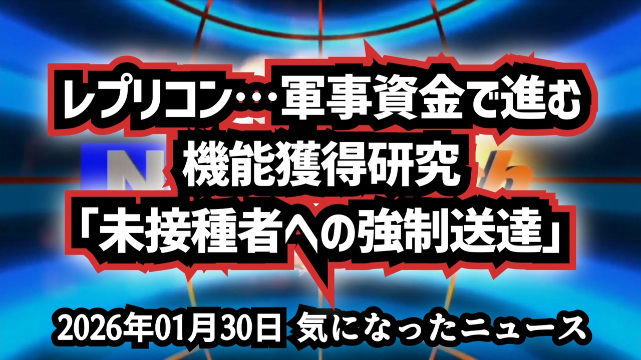 ◆レプリコンワクチン:軍事資金で進む機能獲得研究「未接種者への強制送達」<br><br>未接種者へ届く恐怖の「経鼻型」<br>軍が主導する『強制接種』の実験<br>科学の名を借りた『生物兵器』か<br><br>あらすじ<br>米国国防総省の資金を受け、体内でウイルス同様に増殖を続ける『自己増幅型(レプリコン)mRNAワクチン』の開発が加速しています。特筆すべきは、ワクチンを拒む層に対しても全人口へ迅速に送達するための「概念実証」として、経鼻投与方式が検討されている点です。致死的な鳥インフルエンザを人工操作する『機能獲得研究』との密接な関わりや、製薬企業との不透明な利害関係は、これが単なる医療を超えた『バイオセキュリティ』の領域にあることを示唆しています。現代の『軍事技術』が『次世代ワクチン』の名の下に、個人の意思を介さない『強制接種』を可能にする未来。その『生物兵器』的な側面の真実に迫ります。<br><br>◆今回の詳細(台本です)<a href="https://keiichiro8140.hatenablog.com/entry/26012999333999" target="_blank" rel="noopener nofollow">https://keiichiro8140.hatenablog.com/entry/26012999333999</a><br><br>◆これまでの動画<a href="https://x.gd/sPXoJ" target="_blank" rel="noopener nofollow">https://x.gd/sPXoJ</a><br><br>◆もしも(BAN)の時のためのマイリンク集<a href="https://lit.link/K-16_News44" target="_blank" rel="noopener nofollow">https://lit.link/K-16_News44</a><br><br>ご覧いただきありがとうございます<br>m(_ _)m<br><br>気になったニュース 2026/01/30<br><br />著作権、肖像権に配慮して作成しております。<br><br>◆気になったニュースの台本!?<br>メモ代わりに作った台本をそのままあげてます<br><a href="https://keiichiro8140.hatenablog.com/." target="_blank" rel="noopener nofollow">https://keiichiro8140.hatenablog.com/.</a><br><br><br>ここからはシリーズ紹介<br><br><br>◆ ワクチン解毒・デトックス<br><a href="https://x.gd/fZweg" target="_blank" rel="noopener nofollow">https://x.gd/fZweg</a><br><br>◆ウイリアム・マキス博士のがん治療(イベルメクチン・フェンベンダゾール等)<br><a href="https://x.gd/AtFYS" target="_blank" rel="noopener nofollow">https://x.gd/AtFYS</a><br><br>◆予防接種健康被害救済制度<br><a href="https://x.gd/0xK9x" target="_blank" rel="noopener nofollow">https://x.gd/0xK9x</a><br><br>◆気になったニュース #1501~<br><br>◆ 【ショートver】気になったニュース<br><a href="https://x.gd/7MxXC" target="_blank" rel="noopener nofollow">https://x.gd/7MxXC</a><br><br>◆ 気になったニュース #1001~<br><a href="https://x.gd/Lp8gv" target="_blank" rel="noopener nofollow">https://x.gd/Lp8gv</a><br><br>◆ 気になったニュース #501~<br><a href="https://x.gd/EmbS4" target="_blank" rel="noopener nofollow">https://x.gd/EmbS4</a><br><br>◆ 気になったニュース #1~#500<br><a href="https://x.gd/uPhNb" target="_blank" rel="noopener nofollow">https://x.gd/uPhNb</a><br><br>◆ X(旧Twitter)・テレグラムで気になった情報<br><a href="https://x.gd/YG6FT" target="_blank" rel="noopener nofollow">https://x.gd/YG6FT</a><br><br>◆ 日比谷5万人パレードデ⚪生放送アーカイブ動画<br><a href="https://x.gd/3CHJv" target="_blank" rel="noopener nofollow">https://x.gd/3CHJv</a><br><br>◆日比谷5万人パレード⚪モのマイリスト作ってみました<br><a href="https://nico.ms/mylist/76828848?ref=sp_other" target="_blank" rel="noopener nofollow">https://nico.ms/mylist/76828848?ref=sp_other</a><br><br>◆3.30 令和の百姓⚪⚪<br><a href="https://www.nicovideo.jp/series/511791?ref=garage_share_other" target="_blank" rel="noopener nofollow">https://www.nicovideo.jp/series/511791?ref=garage_share_other</a><br><br>◆ 及川幸久さんの【XNEWS】シリーズ<br><a href="https://x.gd/3k78K" target="_blank" rel="noopener nofollow">https://x.gd/3k78K</a><br><br>◆これまでの動画<a href="https://x.gd/sPXoJ" target="_blank" rel="noopener nofollow">https://x.gd/sPXoJ</a><br><br>◆もしも(BAN)の時のためのマイリンク集<a href="https://lit.link/K-16_News44" target="_blank" rel="noopener nofollow">https://lit.link/K-16_News44</a><br><br>