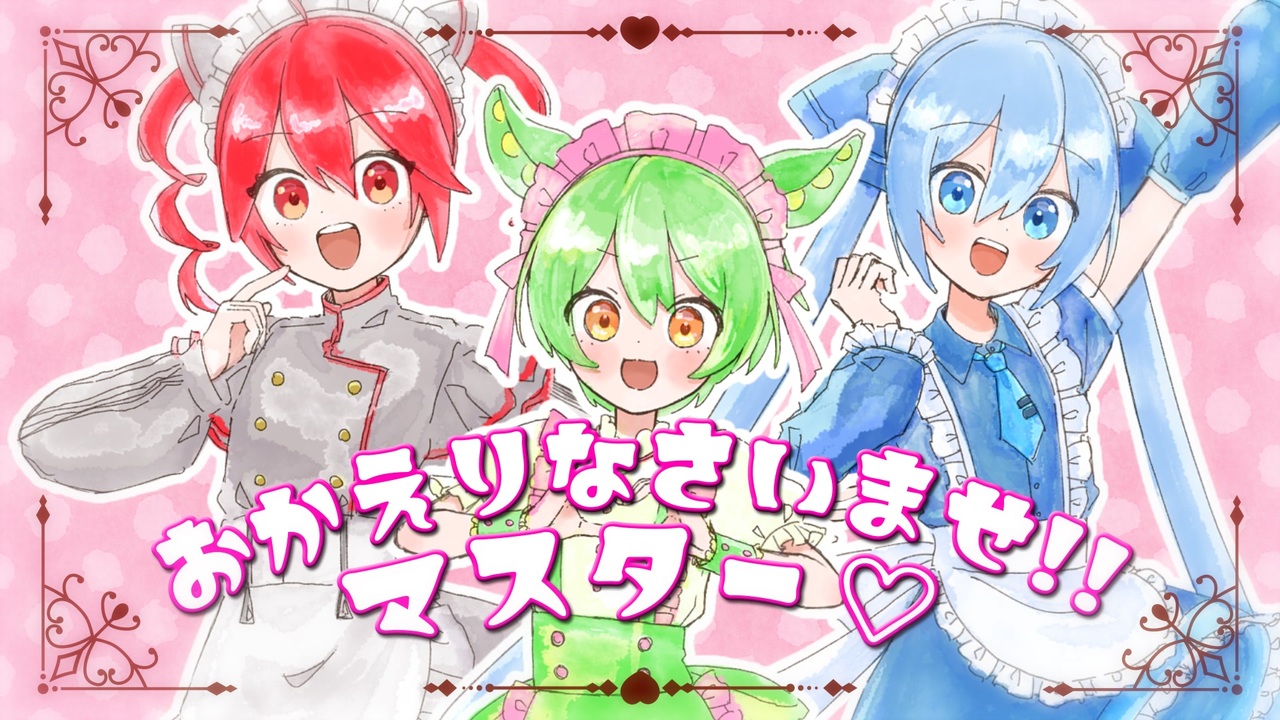 「おかえりなさいませ!!マスター♡」<br><br>Vocal : 初音ミク(Piapro Studio)・重音テト(Synthesizer V)・ずんだもん(CeVIO AI)<br>Music : マヨイ雨<br>Arrangement : カミヰユウ<br>Lyrics : カミヰユウ<br>Illustration : カミヰユウ<br>Movie : 白雪 姫那。<br><br>白雪 姫那。<br>( <a href="https://x.com/SirayukiHina328" target="_blank" rel="noopener nofollow">https://x.com/SirayukiHina328</a> )<br>春芝 マヨイ雨<br>( <a href="https://x.com/s_harushiba" target="_blank" rel="noopener nofollow">https://x.com/s_harushiba</a> )<br>カミヰユウ マヨイ雨<br>( <a href="https://x.com/yu_kamii_p" target="_blank" rel="noopener nofollow">https://x.com/yu_kamii_p</a> )<br><br>【歌詞】<br><br>\おかえりなさいませ!!マスター♡/<br><br>ベルの音で 幕を開ける<br>この世界で 君を待ってた<br>リボン結んで にっこり笑ったら<br>準備はOK!! いくよマスター!!<br><br>失敗だって バラバラだって<br>集まればほら ハーモニー<br>「できない」より 「やってみよう!」<br>その一言が 合図だよ!!<br><br>萌え萌えきゅきゅん♡で 魔法をかけるよ<br>リンクする僕らの世界<br>ひとりじゃ未完成なメロディも<br>声合わせれば 歌になる!!<br><br>萌え萌えきゅきゅん♡で 君も一緒に<br>奏でよう この場所から<br>「また来てね♡」が エンディング<br>でも物語は まだまだ続くよ〜!!<br><br>時計の針が ちょっと早送り<br>締切間近 ドキドキ警報<br>寝不足顔は 頑張った証だね!!<br>諦めないで 君の大好きを!!<br><br>躓いたって 立ち止まったって<br>僕らが そばにいるよ<br>君なら きっと大丈夫<br>何度だって 進めるよ<br><br>萌え萌えきゅきゅん♡で 最後の魔法<br>大好きを信じて 歌おう<br>焦りも不安も ミスだって<br>全部まとめて ステージへ!!<br><br>萌え萌えきゅきゅん♡で 紡いでいく<br>カラフルな心 合わせて<br>同じ夢を 抱いてる<br>僕らの声を 世界に響かせよう<br><br>僕ら 君の想い歌うメイド<br><br>\いってらっしゃいませ!!/<br><br><a target="_blank" href="https://qa.nicovideo.jp/faq/show/19424?site_domain=default" style="font-size: 13px;color: #657586; text-decoration: underline; line-height: 1.4">この動画は投稿者によって修正されました</a>