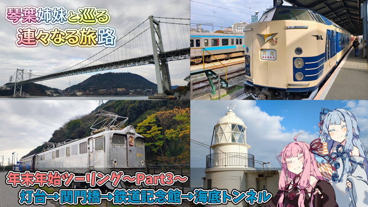 ここからが、旅の本番や!<br><br>名門大洋フェリーで新門司港へ。<br>九州では関門海峡大橋と九州鉄道記念館しか行先決まってないので、<br>海沿いをぶらぶら走りつつ関門海峡トンネルに向かいます。<br>琴葉姉妹のやりとりと一緒に、<br>「九州の景色をひと口味わって、本州へ抜けていく感じ」を一緒に楽しんでもらえたら嬉しいです。<br><br>583系の近郊形改造715系(419系)をもっと知りたい人は、親作品登録した動画を見てね!<br><a href="https://www.nicovideo.jp/watch/sm8789672" class="watch">sm8789672</a>:国鉄の置き土産 食パン419系【迷列車列伝#02】<br><br>前動画 Part2(掛川→大阪南港)<a href="https://www.nicovideo.jp/watch/sm45866289" class="watch">sm45866289</a>→本動画<br>→次の動画 Part3(関門海峡トンネル→本土最西端→角島→豊田市) 2/13?(台本完成)<br>※先に1月分コメント返し動画を作ります!<br> 2/3 20:00に投稿予定<br><br>撮影カメラ:OSMO360(動画)MOTOROLA EDGE 50S PRO(写真)<br>撮影バイク:VERSYS650(2015)<br>ボイス:A.I.voice2(琴葉姉妹)<br>立ち絵:【からい】様<br><br>Xやってます。旅の写真や製作についてポストしてます。<br>※無言フォロー可です!<br><a href="https://x.com/azurebird?t=7vv2dCyR5_1wh0o92CNUbQ&s=09" target="_blank" rel="noopener nofollow">https://x.com/azurebird?t=7vv2dCyR5_1wh0o92CNUbQ&s=09</a><br><br>PS.葵「お姉ちゃんは、車・飛行機・鉄道何が好きなの?」<br> 茜「んー乗り物なら、全部!」<br> 葵「・・・・」<br> 葵「じゃあさ?787って聞いて、何を思い浮かべる?」<br> 茜「そりゃ~マツダの787Bやろ!」<br> 葵「はい、車好き〜!」<br><br> ※他に、ボーイング787やJR九州787系特急電車など