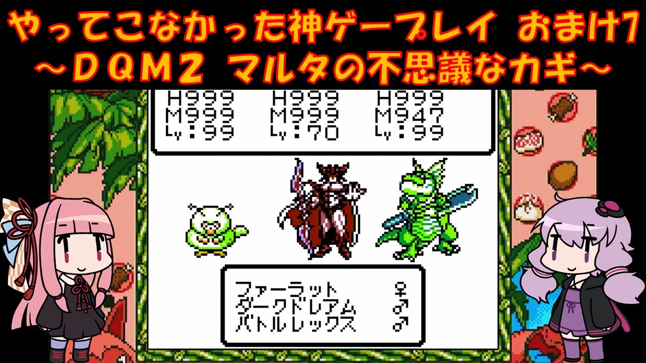 GBC ドラゴンクエストモンスターズ2 マルタの不思議なカギをプレイ<br>ゆかりさんはメジャーじゃないゲームをやる俺カッケー族だったのでドラクエをやったことがありませんでした(DSのⅤ以外)<br><br>ゆ:テリー曇らせ三銃士を連れて来たよ<br>茜:テリー曇らせ三銃士?<br><br>PART1:<a href="https://www.nicovideo.jp/watch/sm45684209" target="_blank" rel="noopener nofollow">https://www.nicovideo.jp/watch/sm45684209</a><br><br>各DQシリーズ再生リスト<br><a href="https://garage.nicovideo.jp/niconico-garage/video/series/390298" target="_blank" rel="noopener nofollow">https://garage.nicovideo.jp/niconico-garage/video/series/390298</a><br><br><br>動画内で使用させていただいた素材<br>【イラスト】<br>結月ゆかり→山栗鼠様:<a href="https://seiga.nicovideo.jp/seiga/im5354179" target="_blank" rel="noopener nofollow">https://seiga.nicovideo.jp/seiga/im5354179</a><br>琴葉茜→山栗鼠様:<a href="https://seiga.nicovideo.jp/seiga/im5342445" target="_blank" rel="noopener nofollow">https://seiga.nicovideo.jp/seiga/im5342445</a><br><br>【音声】<br>A.I.Voice:琴葉茜<br><a href="https://aivoice.jp/product/kotonoha/" target="_blank" rel="noopener nofollow">https://aivoice.jp/product/kotonoha/</a><br><br>A.I.Voice:結月ゆかり<br><a href="https://aivoice.jp/product/yukari/" target="_blank" rel="noopener nofollow">https://aivoice.jp/product/yukari/</a><br><br>この動画で利用している株式会社スクウェア・エニックスを代表とする共同著作者が権利を所有する著作物及びスギヤマ工房有限会社が権利を所有する楽曲の転載・配布は禁止いたします。<br>© ARMOR PROJECT/BIRD STUDIO/SQUARE ENIX All Rights Reserved.<br>© SUGIYAMA KOBO
