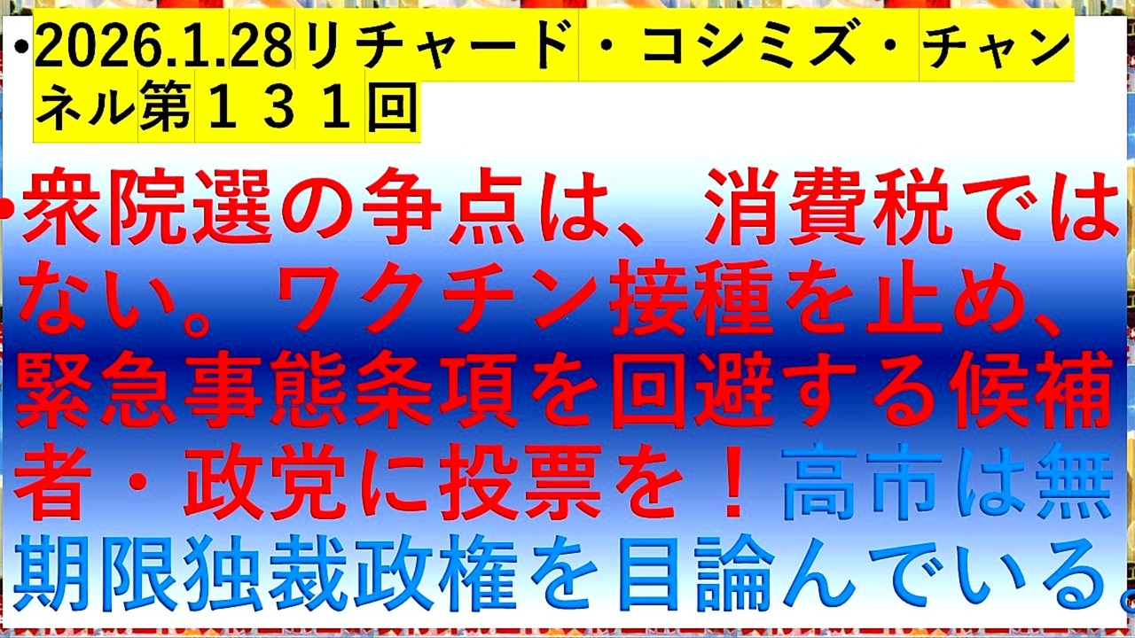 <span style="color: #cc0000;"><strong>◐『「 リチャード・コシミズ・チャンネル 」⦅ 第131回放送 ⦆⦅ 改良版 ⦆』</strong></span><br><br> <span style="color: #ff0000;"><strong>「『 川田龍平候補 演説 』。『 衆院選 』の『 争点 』は、『 消費税 』ではない。『 ワクチン接種 』を『 止め 』、『 緊急事態条項 』を<br> 『 回避 』する『 候補者 』・『 政党 』に『 投票 』を!『 高市早苗 』は『 無期限独裁政権 』を『 目論んでいる 』」</strong></span><br><br> <span style="color: #38761d;"><strong>◐『 リチャード・コシミズ・チャンネル</strong></span><span style="color: #ff0000;"><strong>⦅ ニコニコ チャンネル ⦆</strong></span><span style="color: #38761d;"><strong>』</strong></span><br> <span style="color: #0000ff;"><strong><a href="https://ch.nicovideo.jp/richardkoshimizu" target="_blank" rel="noopener nofollow">https://ch.nicovideo.jp/richardkoshimizu</a></strong></span><br><br> <span style="color: #38761d;"><strong>◐『「 リチャード・コシミズ 講演会 」</strong></span><span style="color: #ff0000;"><strong>公式「 動画ギャラリー 」⦅ 最新動画 ⦆⦅ YouTube版 ⦆</strong></span><span style="color: #38761d;"><strong>』</strong></span><br> <span style="color: #0000ff;"><strong> <a href="https://www.youtube.com/@richardkoshimizu-video-gallery" target="_blank" rel="noopener nofollow">https://www.youtube.com/@richardkoshimizu-video-gallery</a></strong></span><br>