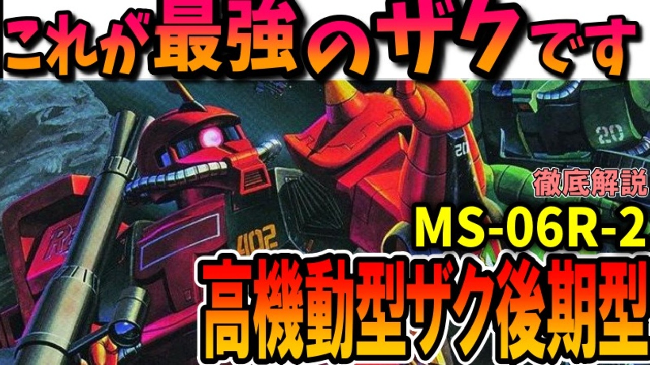 MS-06R-2 高機動型ザクII後期型は、高機動型ザクIIをベースに大幅な改修を施した高性能MSです。<br>本動画では、設定資料をもとに、開発経緯や機体性能、これほどの性能なのになぜ消えてしまったのかを中心に解説します。<br><br>【これが最強のザクです】MS-06R-2 高機動型ザクII後期型を徹底解説【ガンダムMSV】 今回は解説が多めです。<br><br>結局こだわりを持った人たちは同じ行動に行き着いちゃうのかもしれませんね。<br>良くも悪くも・・・。<br><br>閃光のハサウェイは動画作成遅れたので見に行けませんでした。<br>うおおおん。<br><br>現在連載中の小説を見てくださる方はこちら:<br>死に戻り34回目、もう疲れたので私アイドルになります!<br>※初期コンセプトは死に戻ったガルマがシャアを救うにはどうしたら良いのか的な物語を全部女の子でやった感じです。<br>※ここが駄目、もっとこうしたらなどのアドバイスも大歓迎です<br><a href="https://kakuyomu.jp/works/16817330662598051943" target="_blank" rel="noopener nofollow">https://kakuyomu.jp/works/16817330662598051943</a><br><br>質問、などありましたらこちらにも<br><a href="https://twitter.com/@i4S0LHspdgzBTor" target="_blank" rel="noopener nofollow">https://twitter.com/@i4S0LHspdgzBTor</a><br><br>清見元康名義でカクヨム、小説家になろう、たいあっぷなどに投稿しています。<br>もし良ければ応援お願いしますm(_ _)m<br><a href="https://kakuyomu.jp/users/GariD/works" target="_blank" rel="noopener nofollow">https://kakuyomu.jp/users/GariD/works</a><br><br>以前の作品(短編シリアス):<br>転生した厄災の大魔女はやがて聖女と呼ばれる<br><a href="https://ncode.syosetu.com/n0827ha/" target="_blank" rel="noopener nofollow">https://ncode.syosetu.com/n0827ha/</a><br><br>A.I.VOICE:結月ゆかり<br>VOICEVOX:ずんだもん<br><br>使用させていただいたずんだもん:<br>ずんだもん mini Deluxe(立ち絵) ver1.2<br><a href="https://seiga.nicovideo.jp/seiga/im10794509" target="_blank" rel="noopener nofollow">https://seiga.nicovideo.jp/seiga/im10794509</a><br><br>いつも広告、コメントありがとうございます。<br>励みになりますm(_ _)m<br>
