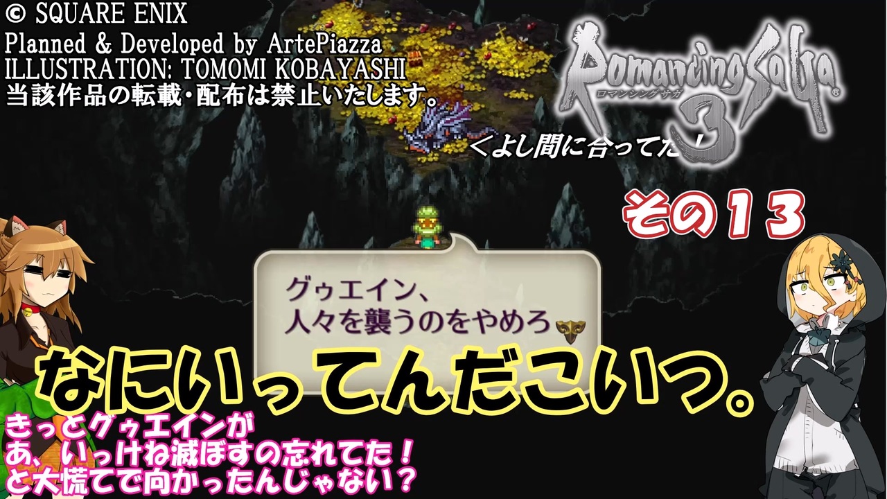 この動画はスチーム版ロマンシング・サガ3のかるーい縛り実況動画です。<br><br>●縛り?内容<br>・サラは控えでコマンダーモードオンリー<br>(ごく一部の戦闘では強制参戦させられるため術攻撃許可)<br>・パーティメンバーの武器や術は指定のみ使用(メンバー揃ったので記載)<br>ネコ耳(代理:少年→吸血鬼) 斧・棍棒・大剣・弓・特殊(吸血鬼技)<br>43(代理:ユリアン)二刀流できればなんでもOK(銀の手を必ず装備)<br>490(代理:エレン)素手・火術・太陽術<br>イクシース(代理:ミューズ)剣・大剣・小剣<br>ミント(代理:モニカ)弓・土術・月術<br><br>※43ちゃん、490姉さんは470/43様のオリジナルキャラクターです<br> 参考動画:<a href="https://www.nicovideo.jp/watch/sm40839724" class="watch">sm40839724</a> <a href="https://www.nicovideo.jp/watch/sm44979749" class="watch">sm44979749</a><br>※イクシース、ミントはろーぐ様のオリジナルキャラクターです。<br> 参考動画:<a href="https://www.nicovideo.jp/watch/sm42425613" class="watch">sm42425613</a><br><br><a href="https://www.nicovideo.jp/watch/sm45886155" class="watch">sm45886155</a> ← 前 次 → そのうち?<br>マイリスト →<a href="https://www.nicovideo.jp/mylist/70943031" target="_blank" rel="noopener">mylist/70943031</a><br><br>※使用Voice(及び配役)<br>VOICEVOX:春日部つむぎ(ネコ耳) (きりたん)四国めたん(イクシース) No.7(ミント・490)<br>CoeFont:アリアル(Voiced by <a href="https://CoeFont.cloud" target="_blank" rel="noopener nofollow">https://CoeFont.cloud</a>(490))<br>立ち絵:ネコ耳(470/43様より頂きました)<br> 43・490(470/43様自作)<br> イクシース・ミント(からい先生のめたち絵)<br><br>© SQUARE ENIX<br>Planned & Developed by ArtePiazza<br>ILLUSTRATION: TOMOMI KOBAYASHI<br>当該作品の転載・配布は禁止いたします。