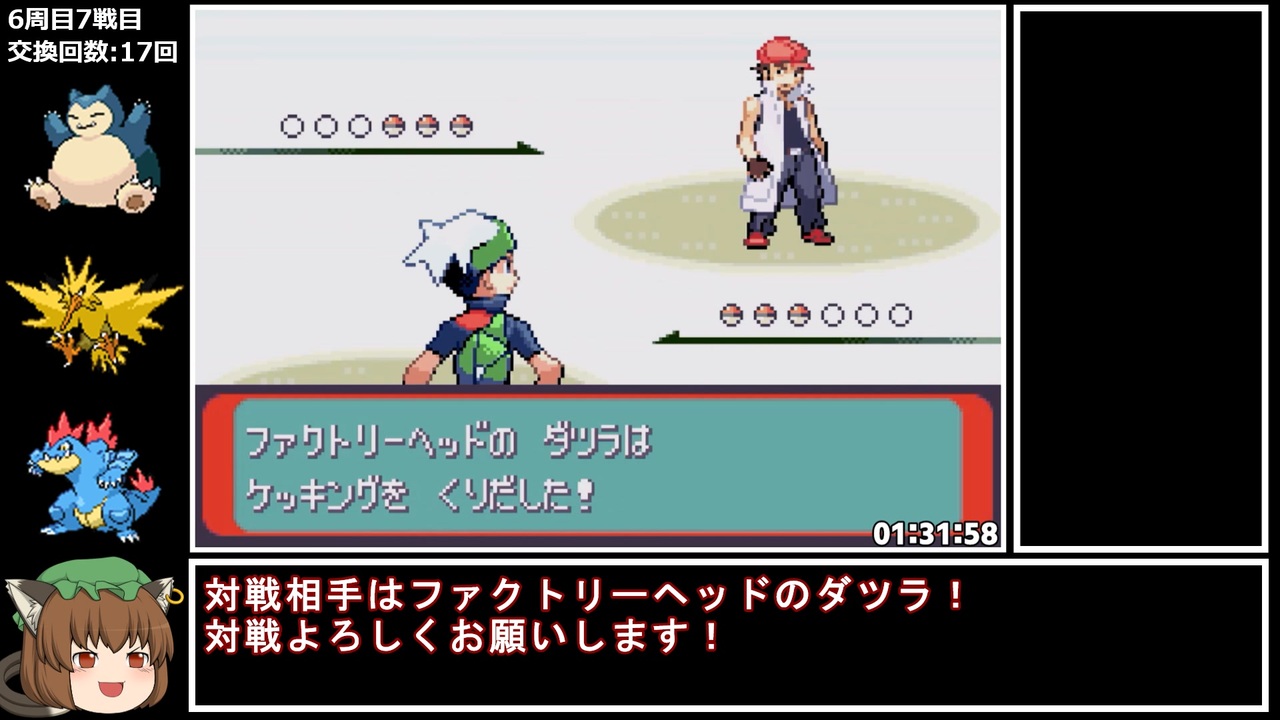 前:<a href="https://www.nicovideo.jp/watch/sm45891674" class="watch">sm45891674</a><br>金ダツラ(50レベル編):<a href="https://www.nicovideo.jp/watch/sm40578866" class="watch">sm40578866</a><br>金ネジキ(50レベル編):<a href="https://www.nicovideo.jp/watch/sm41227704" class="watch">sm41227704</a><br>金ネジキ(オープン編):<a href="https://www.nicovideo.jp/watch/sm43088212" class="watch">sm43088212</a><br><br>計測区間<br>・タイマースタート:0勝状態でバトルファクトリーの受付に話しかけた瞬間<br>・タイマーストップ:42戦目(金ダツラ)で3体目を倒した瞬間<br><br>レギュレーションなど<br>・使用機種:レトロフリーク<br>・シングルバトル/オープン<br>・21戦目は必ずダツラとバトル<br>・乱数調整禁止(ゲームリセット/バトルビデオを見る等)<br>・QL/QS/任意コード/チート等禁止<br><br>RTAまとめ:<a href="https://www.nicovideo.jp/mylist/56827667" target="_blank" rel="noopener">mylist/56827667</a><br>更新報告:<a href="https://twitter.com/yamabukiginu" target="_blank" rel="noopener nofollow">https://twitter.com/yamabukiginu</a><br>無修正版&ボツ録画など:<a href="https://www.youtube.com/channel/UC9-a7YldEwN2MzyjVmb0-kQ" target="_blank" rel="noopener nofollow">https://www.youtube.com/channel/UC9-a7YldEwN2MzyjVmb0-kQ</a><br><br><a target="_blank" href="https://qa.nicovideo.jp/faq/show/19424?site_domain=default" style="font-size: 13px;color: #657586; text-decoration: underline; line-height: 1.4">この動画は投稿者によって修正されました</a>