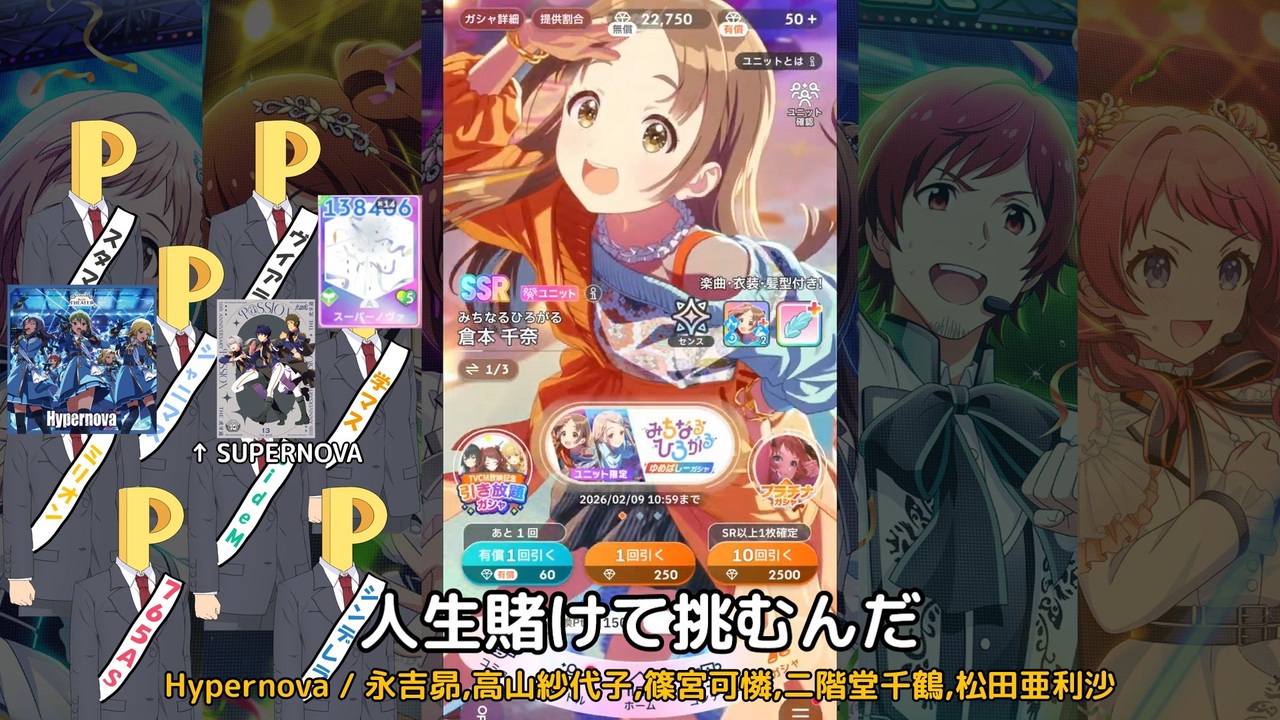 MOIW2025で披露された楽曲すべてを使いました。<br>抜けがあったらすみません。<br><br>前回(理論武装してガチャ):<a href="https://www.nicovideo.jp/watch/sm45702635" target="_blank" rel="noopener nofollow">https://www.nicovideo.jp/watch/sm45702635</a><br>オマケ単品:<a href="https://www.nicovideo.jp/watch/sm45899804" target="_blank" rel="noopener nofollow">https://www.nicovideo.jp/watch/sm45899804</a><br><br>《宣伝》<br>SideM朗読劇無料配信について:<a href="https://x.com/SideM_official/status/2016073700253053262?s=20" target="_blank" rel="noopener nofollow">https://x.com/SideM_official/status/2016073700253053262?s=20</a><br>SideMシーパラコラボ 公式サイト:<a href="https://atfes.com/contents/passionfinal" target="_blank" rel="noopener nofollow">https://atfes.com/contents/passionfinal</a><br>みちなるひろがる公式MV:<a href="https://www.youtube.com/watch?v=qwfpgEhngVI" target="_blank" rel="noopener nofollow">https://www.youtube.com/watch?v=qwfpgEhngVI</a><br><br>《お借りしたもの》<br>Pヘッド立ち絵:<a href="https://www.pixiv.net/artworks/64760465" target="_blank" rel="noopener nofollow">https://www.pixiv.net/artworks/64760465</a><br><br>《追記》<br>コメントたくさんありがとうございます。<br>よく聞かれる質問に答えていきますね。↓<br><br>Q. うp主はBeitP?<br>A. はい。Beitのピエールくん(315にめちゃくちゃかわいい)のPをしています。<br> ここだけの話、ピエールくんのCVは堀江瞬さんだそうです。秘密だよ。<br> 動画内で使っているユニコレ・ソロコレはオススメです。<br> また315プロでは、High×Jokerの秋山隼人くんや、<br> C.FIRSTの天峰秀くんも担当しています。<br><br>Q. なんで無償石が天井分も溜められるの?<br>A. 体感ですが2~3ヶ月くらいガチャを我慢すると溜まります。<br> 千奈ちゃんと莉波さんと新規実装キャラ(理論武装しての燕など)以外のガチャは、<br> 固い意志で我慢しています。<br> アイマスのソシャゲの石、高すぎ!!!!