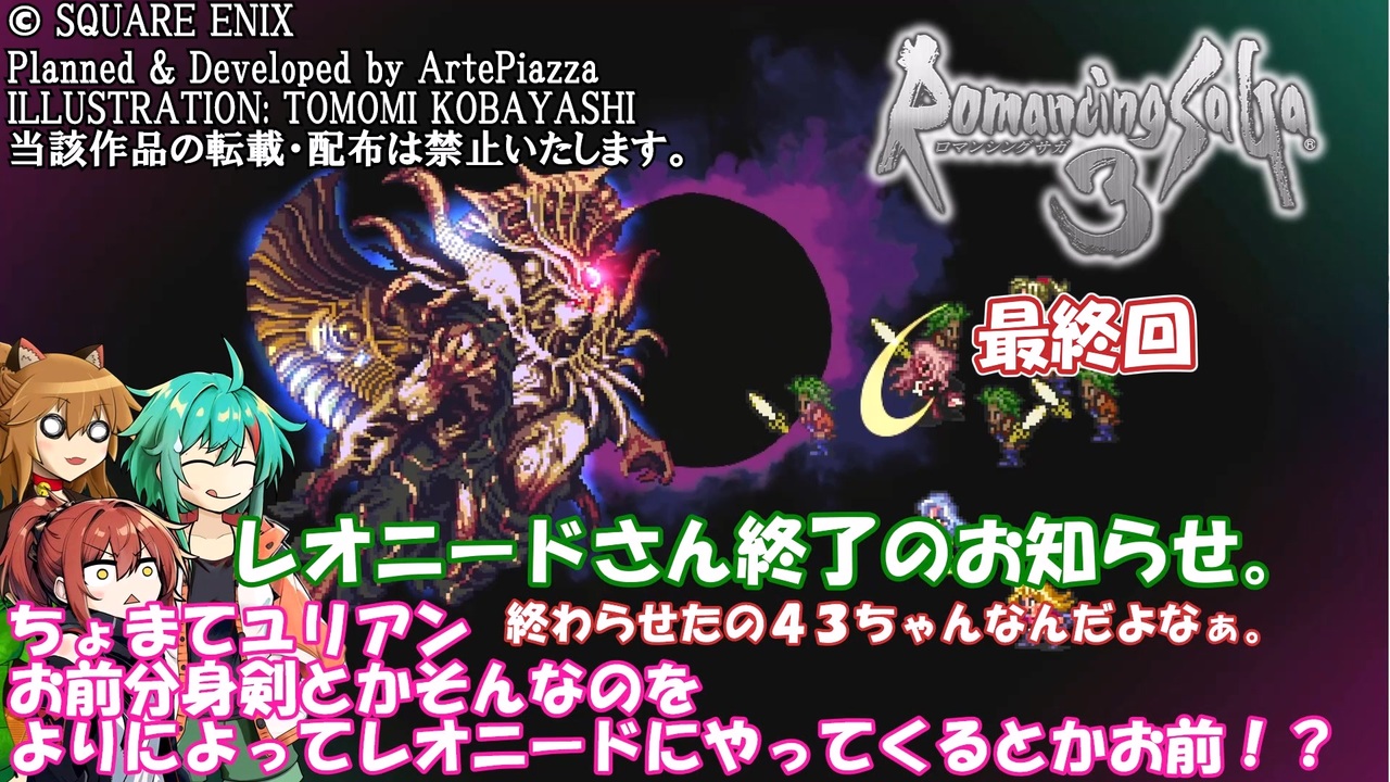 この動画はスチーム版ロマンシング・サガ3のかるーい縛り実況動画でした。<br><br>●縛り?内容<br>・サラは控えでコマンダーモードオンリー<br>(ごく一部の戦闘では強制参戦させられるため術攻撃許可)<br>・パーティメンバーの武器や術は指定のみ使用(メンバー揃ったので記載)<br>ネコ耳(代理:少年→吸血鬼) 斧・棍棒・大剣・弓・特殊(吸血鬼技)<br>43(代理:ユリアン)二刀流できればなんでもOK(銀の手を必ず装備)<br>490(代理:エレン)素手・火術・太陽術<br>イクシース(代理:ミューズ)剣・大剣・小剣<br>ミント(代理:モニカ)弓・土術・月術<br><br>※43ちゃん、490姉さんは470/43様のオリジナルキャラクターです<br> 参考動画:<a href="https://www.nicovideo.jp/watch/sm40839724" class="watch">sm40839724</a> <a href="https://www.nicovideo.jp/watch/sm44979749" class="watch">sm44979749</a><br>※イクシース、ミントはろーぐ様のオリジナルキャラクターです。<br> 参考動画:<a href="https://www.nicovideo.jp/watch/sm42425613" class="watch">sm42425613</a><br><br><a href="https://www.nicovideo.jp/watch/sm45896685" class="watch">sm45896685</a>← 前 おしまい。<br>マイリスト →<a href="https://www.nicovideo.jp/mylist/70943031" target="_blank" rel="noopener">mylist/70943031</a><br><br>※使用Voice(及び配役)<br>VOICEVOX:春日部つむぎ(ネコ耳) (きりたん)四国めたん(イクシース) No.7(ミント・490)<br>CoeFont:アリアル(Voiced by <a href="https://CoeFont.cloud" target="_blank" rel="noopener nofollow">https://CoeFont.cloud</a>(490))<br>立ち絵:ネコ耳(470/43様より頂きました)<br> 43・490(470/43様自作)<br> イクシース・ミント(からい先生のめたち絵)<br><br>© SQUARE ENIX<br>Planned & Developed by ArtePiazza<br>ILLUSTRATION: TOMOMI KOBAYASHI<br>当該作品の転載・配布は禁止いたします。