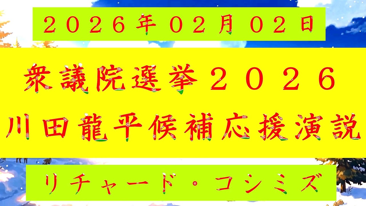 <span style="color: #cc0000;"><strong>◐『 リチャード・コシミズ「 衆議院選挙 2026 川田龍平候補 応援演説 」⦅ 改良版 ⦆』</strong></span><br><br> <span style="color: #ff0000;"><strong>「『 千葉県流山市 イトーヨーカドー前 街頭 』。『 サリドマイド被害者 増山ゆかりさん 』・『 リチャード・コシミズ 』が『 応援 』! 」</strong></span><br><br> <span style="color: #38761d;"><strong>◐『 リチャード・コシミズ・チャンネル</strong></span><span style="color: #ff0000;"><strong>⦅ ニコニコ チャンネル ⦆</strong></span><span style="color: #38761d;"><strong>』</strong></span><br> <span style="color: #0000ff;"><strong><a href="https://ch.nicovideo.jp/richardkoshimizu" target="_blank" rel="noopener nofollow">https://ch.nicovideo.jp/richardkoshimizu</a></strong></span><br><br> <span style="color: #38761d;"><strong>◐『「 リチャード・コシミズ 講演会 」</strong></span><span style="color: #ff0000;"><strong>公式「 動画ギャラリー 」⦅ 最新動画 ⦆⦅ YouTube 版 ⦆</strong></span><span style="color: #38761d;"><strong>』</strong></span><br> <span style="color: #0000ff;"><strong> <a href="https://www.youtube.com/@richardkoshimizu-video-gallery" target="_blank" rel="noopener nofollow">https://www.youtube.com/@richardkoshimizu-video-gallery</a></strong></span><br><br>
