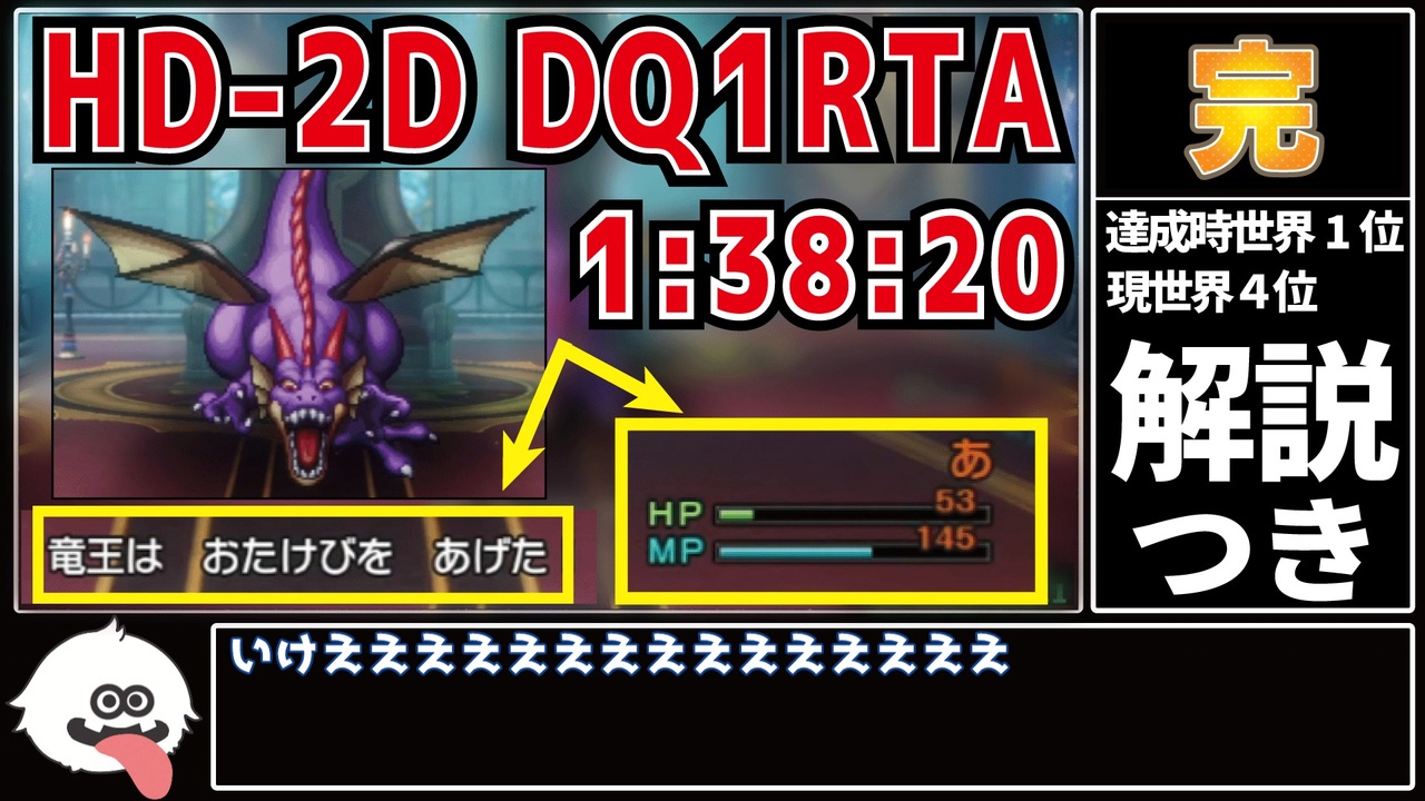達成時世界記録でしたが3日で陥落しました。<br>三日天下とはまさにこのこと・・・<br>解説動画として供養させてください、よろしくお願いします<br><br>前回¦<a href="https://www.nicovideo.jp/watch/sm45895281" class="watch">sm45895281</a><br>--------------------------<br>📚参考資料<br>・HD-2Dドラゴンクエスト1RTAチャート(v1.0.1.0) by Eru氏<br>(<a href="https://springwilddance.hatenablog.com/entry/2025/11/27/073433)" target="_blank" rel="noopener nofollow">https://springwilddance.hatenablog.com/entry/2025/11/27/073433)</a><br>・ドラゴンクエストⅠ&Ⅱ公式ガイドブック<br>(<a href="https://store.jp.square-enix.com/item/9784301000846.html?srsltid=AfmBOoppn7QMI9ASYn-ycXnB5zeBSFsPsC_BPHmzg5mbmLkzy0BbWXXB)" target="_blank" rel="noopener nofollow">https://store.jp.square-enix.com/item/9784301000846.html?srsltid=AfmBOoppn7QMI9ASYn-ycXnB5zeBSFsPsC_BPHmzg5mbmLkzy0BbWXXB)</a><br>・ドラクエ1RTAプレイヤーの皆様<br><br>--------------------------<br>🔗各種リンク<br>Youtube ▶ <a href="https://www.youtube.com/@gyukoro_DQFFRTA" target="_blank" rel="noopener nofollow">https://www.youtube.com/@gyukoro_DQFFRTA</a><br>ニコニコ ▶ <a href="https://www.nicovideo.jp/user/9001459" target="_blank" rel="noopener nofollow">https://www.nicovideo.jp/user/9001459</a><br>X(旧Twitter)▶ <a href="https://x.com/gyukoro_nico" target="_blank" rel="noopener nofollow">https://x.com/gyukoro_nico</a><br>チャート置き場 ▶ <a href="https://www.dqffrta.site/" target="_blank" rel="noopener nofollow">https://www.dqffrta.site/</a><br><br>--------------------------<br>✏素材サイト様<br>効果音ラボ<br>DOVA-SYNDROME<br><br>--------------------------<br>#rta <br>#biimシステム <br>#ゆっくり実況 <br>#ゆっくり解説