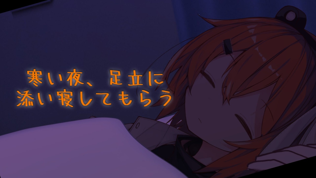 足立のちょっと冷たい体に抱きしめられて頭頂部の排気口からのほんのりとした温かみを感じながら寝たいですよね<br><br>立ち絵<br>桧野拓海様 <a href="https://seiga.nicovideo.jp/seiga/im11571279" target="_blank" rel="noopener">im11571279</a><br><br>背景<br>みんちり様 <a href="https://commons.nicovideo.jp/works/nc351059" target="_blank" rel="noopener">nc351059</a> <a href="https://commons.nicovideo.jp/works/nc227332" target="_blank" rel="noopener">nc227332</a><br>白兎様 <a href="https://commons.nicovideo.jp/works/nc266894" target="_blank" rel="noopener">nc266894</a><br><br>その他素材<br>島ヶ谷慧加様 <a href="https://commons.nicovideo.jp/works/nc438410" target="_blank" rel="noopener">nc438410</a><br><br>効果音、環境音等<br>効果音ラボ様<br>Ma/レアチーズ様 <a href="https://commons.nicovideo.jp/works/nc362917" target="_blank" rel="noopener">nc362917</a><br>Otologic様