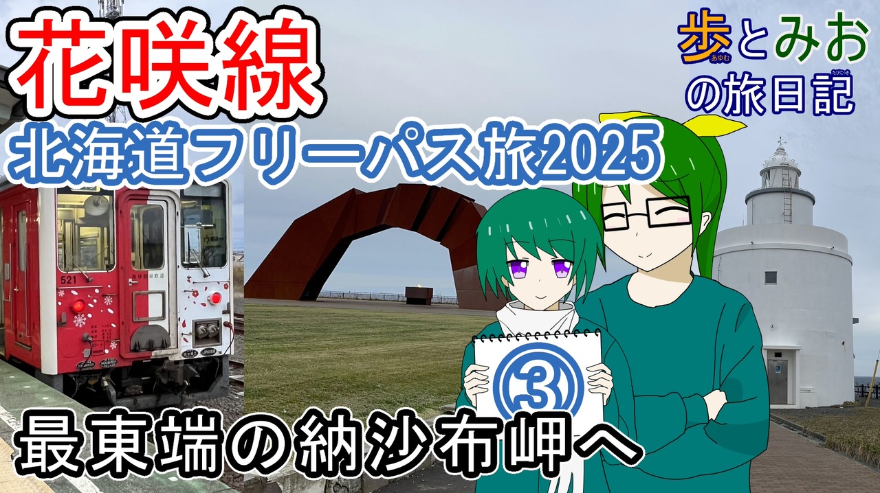 北方領土の日に出したかったのですが、魂オリ祭とかぶるため断念しました。<br>カーン素材もしかしたらかしみや動画に出るかもしれません。<br><br><br><span style="color: #4a86e8;"><strong>北海道フリーパス旅2025のマイリスト↓</strong></span><br>(<a href="https://www.nicovideo.jp/mylist/79117972" target="_blank" rel="noopener">mylist/79117972</a>)<br><br><span style="color: #93c47d;"><strong>北海道フリーパス旅2024(過去作)のマイリスト↓</strong></span><br>(<a href="https://www.nicovideo.jp/mylist/77419028" target="_blank" rel="noopener">mylist/77419028</a>)<br><br><br>【使用BGM】<br>DOVA-SYNDROME<br><a href="https://dova-s.jp" target="_blank" rel="noopener nofollow">https://dova-s.jp</a><br><br>【効果音】<br>効果音ラボ<br><a href="https://soundeffect-lab.info" target="_blank" rel="noopener nofollow">https://soundeffect-lab.info</a><br>【キャラクター提供】<br>かしみや<br>(<a href="https://www.nicovideo.jp/user/74514002" target="_blank" rel="noopener">user/74514002</a>)<br><br>【出演】<br>西谷歩 CV:花隈千冬( CeVIO AI)<br>戸田みお CV:小春六花( CeVIO AI)<br>北宮火乃香 CV:黄琴海月(MY COEIROINK)<br>函館ほくと