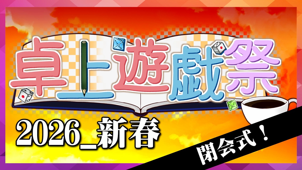 卓上遊戯祭の閉会式動画です。<br>たくさんのご参加ありがとうございました~!!<br><br>後夜祭生放送:2月13日(金)21時~<br>会場:watch/<a href="https://live.nicovideo.jp/watch/lv349860393" target="_blank" rel="noopener">lv349860393</a><br><br>卓上遊戯祭2026マイリスト:<a href="https://www.nicovideo.jp/mylist/78927783" target="_blank" rel="noopener">mylist/78927783</a><br /><br><strong>立ち絵やコモンズ素材など</strong>:コンテンツツリー参照<br><br><span style="font-size: 18px;"><strong>最新動画</strong></span><br>【のびのびTRPG】のびのびコエイロインク! 1周目!【ボイロTRPG】:<a href="https://www.nicovideo.jp/watch/sm45928939" class="watch">sm45928939</a><br><span style="font-size: 18px;"><strong>マイリスト・シリーズ</strong></span><br>シリーズ動画Part1集:<a href="https://www.nicovideo.jp/mylist/66823556" target="_blank" rel="noopener">mylist/66823556</a><br>ボイロTRPGpart1リスト:<a href="https://www.nicovideo.jp/mylist/77484044" target="_blank" rel="noopener">mylist/77484044</a><br>小樽潮風高校TRPG部(潮風卓):<a href="https://www.nicovideo.jp/mylist/78763199" target="_blank" rel="noopener">mylist/78763199</a><br>あおタカ:<a href="https://www.nicovideo.jp/series/77695" target="_blank" rel="noopener">series/77695</a><br>アリアルさん:<a href="https://www.nicovideo.jp/series/324423" target="_blank" rel="noopener">series/324423</a><br>合作まとめ:<a href="https://www.nicovideo.jp/mylist/73765421" target="_blank" rel="noopener">mylist/73765421</a><br>単発・劇場:<a href="https://www.nicovideo.jp/series/454284" target="_blank" rel="noopener">series/454284</a><br>単発・TRPG:<a href="https://www.nicovideo.jp/series/454282" target="_blank" rel="noopener">series/454282</a><br>単発・その他まとめ:<a href="https://www.nicovideo.jp/series/77328" target="_blank" rel="noopener">series/77328</a><br><br><span style="font-size: 18px;"><strong>【Cafe院の連絡先】</strong></span><br>Twitter→<a href="https://twitter.com/CafeIN9610" target="_blank" rel="noopener nofollow">https://twitter.com/CafeIN9610</a><br>動画などの質問を受け付けてるやつ→<a href="https://mond.how/ja/CafeIN9610" target="_blank" rel="noopener nofollow">https://mond.how/ja/CafeIN9610</a><br>動画などの質問を受け付けてるマシュマロ→<a href="https://marshmallow-qa.com/cafein9610?utm_medium=url_text&utm_source=promotion" target="_blank" rel="noopener nofollow">https://marshmallow-qa.com/cafein9610?utm_medium=url_text&utm_source=promotion</a><br>干芋:<a href="https://www.amazon.jp/hz/wishlist/ls/2KVT8NHDPXNI2?ref_=wl_share" target="_blank" rel="noopener nofollow">https://www.amazon.jp/hz/wishlist/ls/2KVT8NHDPXNI2?ref_=wl_share</a>
