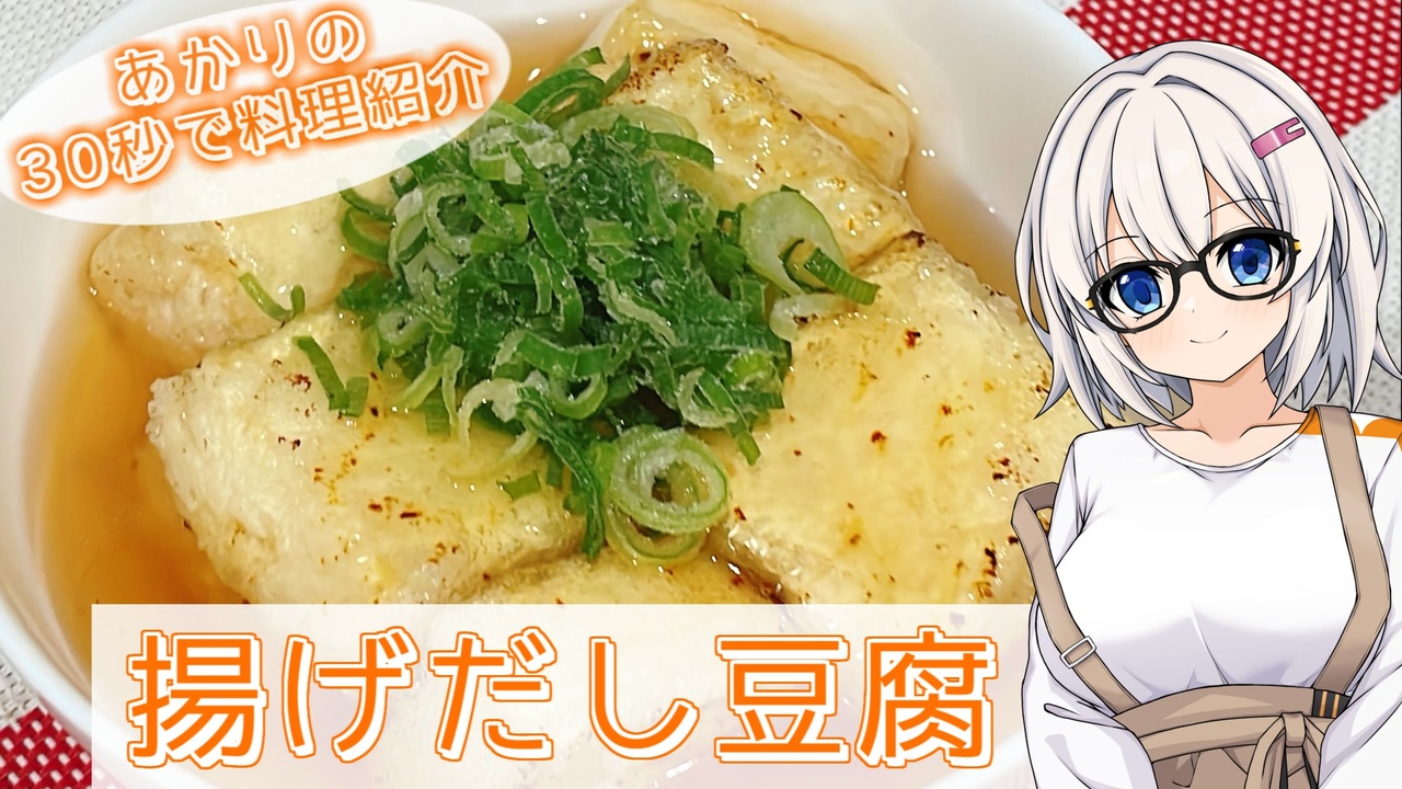 <span style="color: #ff9900; font-size: 16px;"><strong>今回より2ndシリーズになりました!</strong></span><br>新しいあかりちゃんもよろしくお願いします♪<br><br><br>【作り方】<br>①豆腐をパックから取り出し、キッチンペーパーや布巾で包む<br>②お皿などで重しをして10分ほど放置して水気を切る<br>③お鍋に水と出汁パックを入れ、火をつける<br>④沸騰したらそのまま5分煮てだしを抽出<br>⑤出汁パックを取り除いたら、醤油とみりんで味付け<br>⑥水溶き片栗粉を入れて、火をつけとろみがついたらあんの完成<br>⑦水気を切った豆腐を適当な大きさに切る<br>⑧片栗粉をつけて170度で両面カリッとなるまで揚げる<br>⑨器に盛り付けてあんをかけたら完成!<br><br><br>【☆お借りした素敵な素材☆(順不同)】<br><br>【立ち絵】<br>まっく 様<br><br>【いいねボタン】<br>委員長 様<br><br>【素材】<br>ニコニ・コモンズ 様<br><br><br>最後にこの動画を見てくださった皆様に心からの感謝と、<br>これからも良きご縁がありますように!(*´ω`*)<br><br><br><br>紲星あかりの30秒シリーズ<br>【<a href="https://www.nicovideo.jp/mylist/74379659" target="_blank" rel="noopener nofollow">https://www.nicovideo.jp/mylist/74379659</a> 】<br><br><br>Twitter:<a href="https://twitter.com/moegimon" target="_blank" rel="noopener nofollow">https://twitter.com/moegimon</a><br><br>you tube:<a href="https://www.youtube.com/channel/UCP2N3uBfzKEoqCGviIvs0Ew" target="_blank" rel="noopener nofollow">https://www.youtube.com/channel/UCP2N3uBfzKEoqCGviIvs0Ew</a><br><br>ご支援:<a href="https://www.amazon.co.jp/hz/wishlist/ls/ZBWL10H8ML75?ref_=wl_share" target="_blank" rel="noopener nofollow">https://www.amazon.co.jp/hz/wishlist/ls/ZBWL10H8ML75?ref_=wl_share</a><br><br><br><span style="color: #ff0000; font-size: 16px;"><strong>実妹の縁(よすが)と合同アカウント(DW-Double Witch-)<br>こちらも宜しくおねがいします!</strong></span><br><br>Twitter:<a href="https://twitter.com/witchdouble2" target="_blank" rel="noopener nofollow">https://twitter.com/witchdouble2</a><br><br>ニコ動:<a href="https://www.nicovideo.jp/user/89325934" target="_blank" rel="noopener nofollow">https://www.nicovideo.jp/user/89325934</a><br><br>you tube:<a href="https://www.youtube.com/channel/UC12q0n98NSyGykCbsP2G8ig" target="_blank" rel="noopener nofollow">https://www.youtube.com/channel/UC12q0n98NSyGykCbsP2G8ig</a><br>