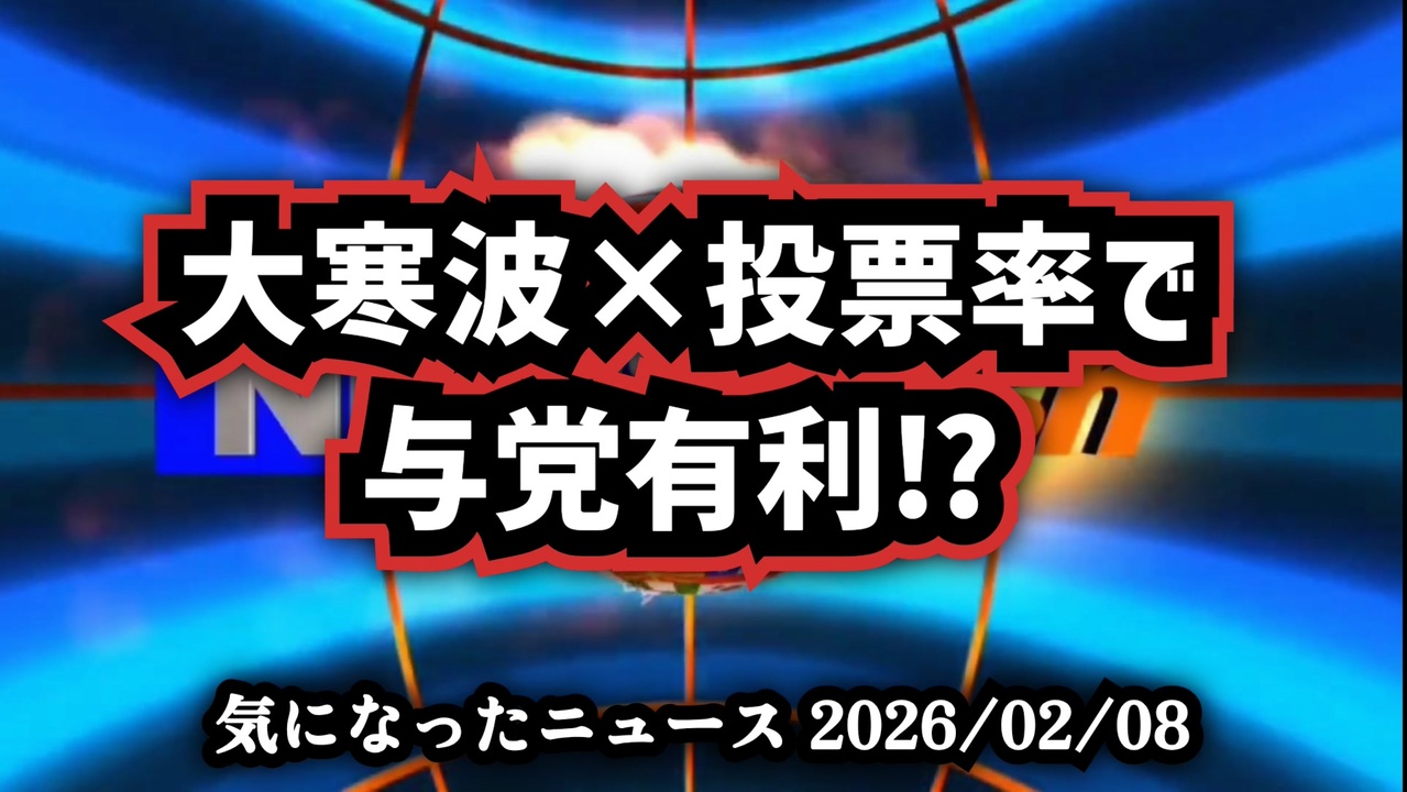 【※2/8昼作成】出せる気で作っていたら実際やばかったので遅くなりました<br><br>◆大寒波・雪で投票率が変わる?2026衆院選リアル予測 ~選挙運動禁止に配慮して遅くなりました<br><br>大寒波×投票率で与党有利⁉<br><br>あらすじ<br>2026年衆院選、全国に雪が広がる予報。天候や投票率、組織票の強さで勝敗が大きく変わる可能性があります。特に北日本や日本海側では低投票率が予想され、若者票は減少、高齢層や固定支持層が有利になる構造。小選挙区では与党が強く、都市部で野党が部分的に残る形が想定されます。雪の日選挙のリアルな影響を分かりやすく解説します。<br><br>タグ11個<br><br>選挙日当日の縛りの関係上、安全を期して遅くなりました<br><br>◆今回の詳細(台本)<a href="https://keiichiro8140.hatenablog.com/entry/26020888111" target="_blank" rel="noopener nofollow">https://keiichiro8140.hatenablog.com/entry/26020888111</a><br><br>◆これまでの動画<a href="https://x.gd/sPXoJ" target="_blank" rel="noopener nofollow">https://x.gd/sPXoJ</a><br><br>◆もしも(BAN)の時のためのマイリンク集<a href="https://lit.link/K-16_News44" target="_blank" rel="noopener nofollow">https://lit.link/K-16_News44</a><br><br><br>野党<br>選挙<br>投票<br>組織票<br>選挙予測<br><br>ご覧いただきありがとうございます<br>m(_ _)m <br><br>気になったニュース 2026/02/08<br><br />著作権、肖像権に配慮して作成しております。<br><br>◆気になったニュースの台本!?<br>メモ代わりに作った台本をそのままあげてます<br><a href="https://keiichiro8140.hatenablog.com/." target="_blank" rel="noopener nofollow">https://keiichiro8140.hatenablog.com/.</a><br><br><br>ここからはシリーズ紹介<br><br><br>◆ ワクチン解毒・デトックス<br><a href="https://x.gd/fZweg" target="_blank" rel="noopener nofollow">https://x.gd/fZweg</a><br><br>◆ウイリアム・マキス博士のがん治療(イベルメクチン・フェンベンダゾール等)<br><a href="https://x.gd/AtFYS" target="_blank" rel="noopener nofollow">https://x.gd/AtFYS</a><br><br>◆予防接種健康被害救済制度<br><a href="https://x.gd/0xK9x" target="_blank" rel="noopener nofollow">https://x.gd/0xK9x</a><br><br>◆気になったニュース #1501~<br><br>◆ 【ショートver】気になったニュース<br><a href="https://x.gd/7MxXC" target="_blank" rel="noopener nofollow">https://x.gd/7MxXC</a><br><br>◆ 気になったニュース #1001~<br><a href="https://x.gd/Lp8gv" target="_blank" rel="noopener nofollow">https://x.gd/Lp8gv</a><br><br>◆ 気になったニュース #501~<br><a href="https://x.gd/EmbS4" target="_blank" rel="noopener nofollow">https://x.gd/EmbS4</a><br><br>◆ 気になったニュース #1~#500<br><a href="https://x.gd/uPhNb" target="_blank" rel="noopener nofollow">https://x.gd/uPhNb</a><br><br>◆ X(旧Twitter)・テレグラムで気になった情報<br><a href="https://x.gd/YG6FT" target="_blank" rel="noopener nofollow">https://x.gd/YG6FT</a><br><br>◆ 日比谷5万人パレードデ⚪生放送アーカイブ動画<br><a href="https://x.gd/3CHJv" target="_blank" rel="noopener nofollow">https://x.gd/3CHJv</a><br><br>◆日比谷5万人パレード⚪モのマイリスト作ってみました<br><a href="https://nico.ms/mylist/76828848?ref=sp_other" target="_blank" rel="noopener nofollow">https://nico.ms/mylist/76828848?ref=sp_other</a><br><br>◆3.30 令和の百姓⚪⚪<br><a href="https://www.nicovideo.jp/series/511791?ref=garage_share_other" target="_blank" rel="noopener nofollow">https://www.nicovideo.jp/series/511791?ref=garage_share_other</a><br><br>◆ 及川幸久さんの【XNEWS】シリーズ<br><a href="https://x.gd/3k78K" target="_blank" rel="noopener nofollow">https://x.gd/3k78K</a><br><br>◆これまでの動画<a href="https://x.gd/sPXoJ" target="_blank" rel="noopener nofollow">https://x.gd/sPXoJ</a><br><br>◆もしも(BAN)の時のためのマイリンク集<a href="https://lit.link/K-16_News44" target="_blank" rel="noopener nofollow">https://lit.link/K-16_News44</a><br><br>