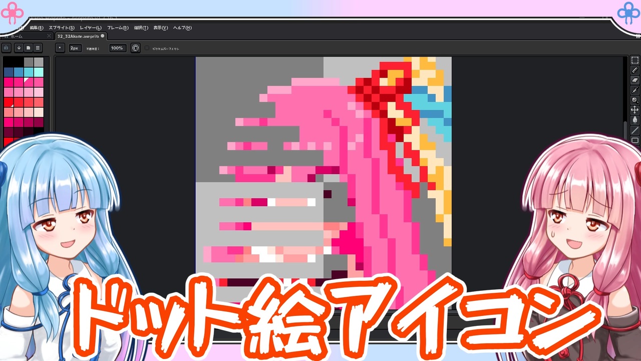 他の投稿者さんを覚えるときにアイコンでイメージすることが多いので自分も作ってみました!<br>普通に描くよりはきれいに作りやすいんじゃないかな…?<br>EDGEなどの無料ソフトもあるみたいなので好きなのを試してみてはどうでしょうか!<br><br>使用ソフト<br>aseprite<br><a href="https://store.steampowered.com/app/431730/Aseprite/" target="_blank" rel="noopener nofollow">https://store.steampowered.com/app/431730/Aseprite/</a><br><br>A.I.VOICE2 琴葉茜・葵<br><br>使用楽曲<br>DOVA-SYNDROME <a href="https://dova-s.jp/より" target="_blank" rel="noopener nofollow">https://dova-s.jp/より</a><br>作中に表示あり<br><br><a target="_blank" href="https://qa.nicovideo.jp/faq/show/19424?site_domain=default" style="font-size: 13px;color: #657586; text-decoration: underline; line-height: 1.4">この動画は投稿者によって修正されました</a>