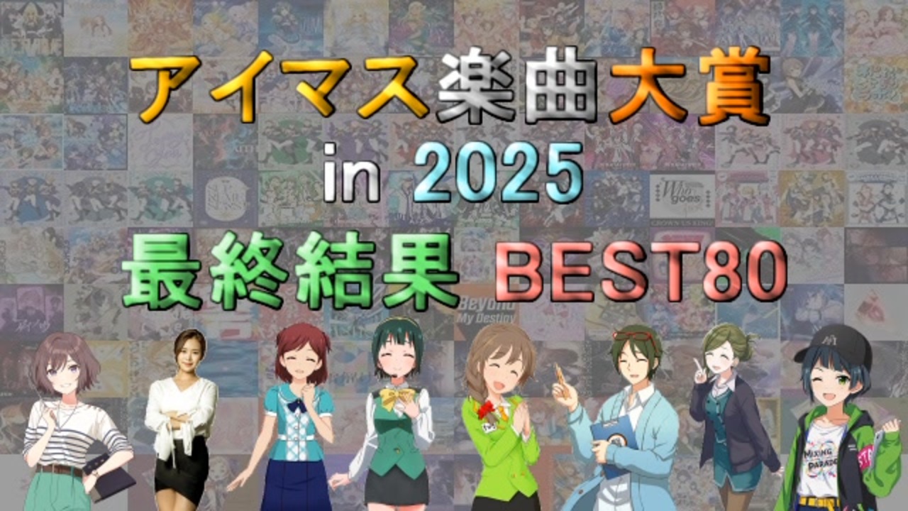 <span style="color: #ff0000; font-size: 24px;"><strong>YOU AND アイ!!!!!!!</strong></span><br><br><span style="color: #0000ff; font-size: 16px;"><strong>2025年にFull音源版が発売 or 配信</strong></span><span style="font-size: 16px;">されたアイマス関連の楽曲(</span><span style="color: #ffd966; font-size: 16px;"><strong>計159曲</strong></span><span style="font-size: 16px;">)<br>に対する人気投票企画の最終結果です。</span><br><span style="color: #00ff00; font-size: 16px;"><strong>参加者3645名</strong></span><span style="font-size: 16px;">の回答を集計し、</span><span style="color: #00ffff; font-size: 16px;"><strong>獲得pt上位80曲</strong></span><span style="font-size: 16px;">を</span><span style="color: #666666; font-size: 16px;"><strong>【分野別データ】</strong></span><span style="font-size: 16px;">と</span><br><span style="color: #ff9900; font-size: 16px;"><strong>【皆様から頂いたコメント】</strong></span><span style="font-size: 16px;">を合わせてご紹介していきます。</span><br><br><span style="font-size: 16px;"><strong>☆配布データ:<a href="https://x.gd/X0TEi" target="_blank" rel="noopener nofollow">https://x.gd/X0TEi</a></strong></span><br><br><span style="font-size: 16px;">●「アイマス楽曲大賞 最終結果まとめ」:<a href="https://www.nicovideo.jp/mylist/70533939" target="_blank" rel="noopener">mylist/70533939</a><br>●『アイマス楽曲ランキングシリーズ』:<a href="https://www.nicovideo.jp/mylist/57911966" target="_blank" rel="noopener">mylist/57911966</a><br>●『THE IDOLM@STER Song Collection』:<a href="https://www.nicovideo.jp/mylist/61493969" target="_blank" rel="noopener">mylist/61493969</a></span><br>