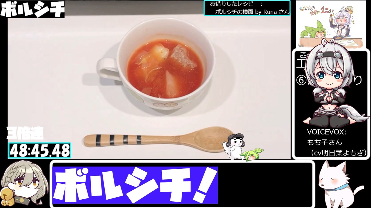 料理初心者がはじめてに作る料理にチャレンジします!<br><br>参考にしたレシピはこちら<br> ボルシチの横面 by Runa さん<br /><br>編集に使用させていただいているものは、プロフィールみてね!<br><a href="https://www.nicovideo.jp/user/311366" target="_blank" rel="noopener nofollow">https://www.nicovideo.jp/user/311366</a><br><br>読み上げ:VOICEVOX もち子(cv明日葉よもぎ)、ずんだもん、四国めたん、青山龍星、WhiteCUL、伊織弓鶴、COEIROINK:猫米茶<br><br><strong>過去の動画にコメント、いいね!、ギフト、広告、フォロー、マイリストありがとうございました!</strong><br><br>とり料理祭ありがとうございました!<br>2023参加作品はこちら ⇒ <a href="https://www.nicovideo.jp/mylist/75430531" target="_blank" rel="noopener nofollow">https://www.nicovideo.jp/mylist/75430531</a><br>2024冬参加作品はこちら ⇒ <a href="https://www.nicovideo.jp/mylist/75862737" target="_blank" rel="noopener nofollow">https://www.nicovideo.jp/mylist/75862737</a><br>2024夏参加作品はこちら ⇒ <a href="https://www.nicovideo.jp/mylist/76572716" target="_blank" rel="noopener nofollow">https://www.nicovideo.jp/mylist/76572716</a><br>2025冬参加作品はこちら ⇒ <a href="https://www.nicovideo.jp/mylist/77171241" target="_blank" rel="noopener nofollow">https://www.nicovideo.jp/mylist/77171241</a><br>2025夏参加作品はこちら ⇒ <a href="https://www.nicovideo.jp/mylist/77600849" target="_blank" rel="noopener nofollow">https://www.nicovideo.jp/mylist/77600849</a><br>2026冬参加作品はこちら ⇒ <a href="https://www.nicovideo.jp/mylist/78784739" target="_blank" rel="noopener nofollow">https://www.nicovideo.jp/mylist/78784739</a><br><br>このその日ごとになんか出す定食屋か駄菓子屋のごとき動画を継続して投稿するために<br>スポンサーをひっそり募集しております、あなたも一口いかが?<br><a href="https://creator-support.nicovideo.jp/registration/311366" target="_blank" rel="noopener nofollow">https://creator-support.nicovideo.jp/registration/311366</a>
