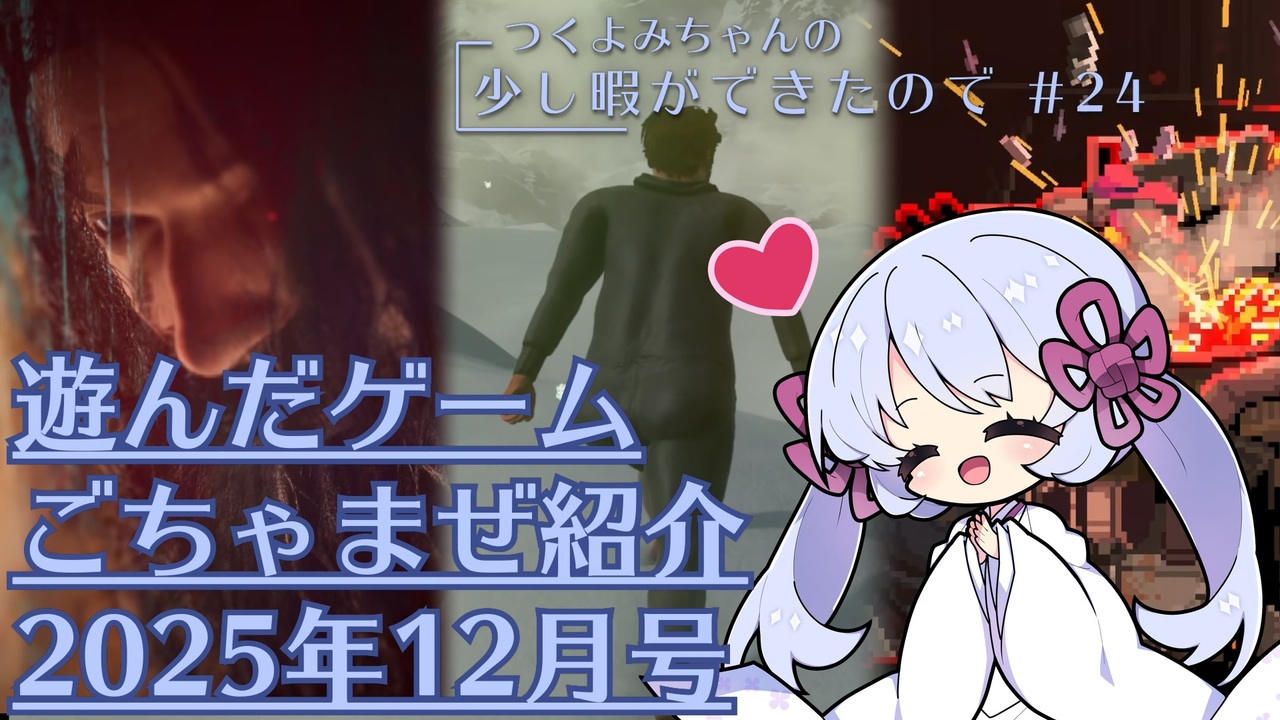 1ヶ月で遊んだゲームの中から、特に気に入ったタイトルを中心に紹介していきます<br>いわゆる「期待の新作!」な動画は巷に溢れていますが<br>実際に遊んで「これ面白かったよ!」なゲーマー得動画を目指したい<br>年が明けてすでに2月ですが年末回です。なんと言おうと年末です<br>2025年の総決算。そして次回から新シーズン突入!<br><br>■紹介タイトル一覧<br>01. Electro Bop Boxing League<br><a href="https://store.steampowered.com/app/3211280/" target="_blank" rel="noopener nofollow">https://store.steampowered.com/app/3211280/</a><br>02. SANABI: A Haunted Day<br><a href="https://store.steampowered.com/app/3996620/" target="_blank" rel="noopener nofollow">https://store.steampowered.com/app/3996620/</a><br>03. The Alters<br><a href="https://store.steampowered.com/app/1601570/" target="_blank" rel="noopener nofollow">https://store.steampowered.com/app/1601570/</a><br>04. Baby Steps<br><a href="https://store.steampowered.com/app/1281040/" target="_blank" rel="noopener nofollow">https://store.steampowered.com/app/1281040/</a><br><br>■クレジット<br>音声|つくよみちゃん (COEIROINK) <a href="https://coeiroink.com/" target="_blank" rel="noopener nofollow">https://coeiroink.com/</a><br>立ち絵|みるくぱんだ様 <a href="https://seiga.nicovideo.jp/seiga/im11045234" target="_blank" rel="noopener">im11045234</a><br>フリー素材キャラクターつくよみちゃん <a href="https://tyc.rei-yumesaki.net/" target="_blank" rel="noopener nofollow">https://tyc.rei-yumesaki.net/</a><br><br>■進行中シリーズ<br>つくよみちゃんの少し暇ができたので|<a href="https://www.nicovideo.jp/series/456738" target="_blank" rel="noopener">series/456738</a>(いまここ)<br>ダークソウル3初見プレイ|<a href="https://www.nicovideo.jp/series/461984" target="_blank" rel="noopener">series/461984</a><br>ゲーム関係Part1|<a href="https://www.nicovideo.jp/mylist/68457079" target="_blank" rel="noopener">mylist/68457079</a><br><br>■Youtube版|<a href="https://youtu.be/5Bkj_8Zvv6U" target="_blank" rel="noopener nofollow">https://youtu.be/5Bkj_8Zvv6U</a><br>■SNS|<a href="https://twitter.com/mizuki_aihr" target="_blank" rel="noopener nofollow">https://twitter.com/mizuki_aihr</a><br><br>■編集後記<br>シーズン2もよろしくお願いします