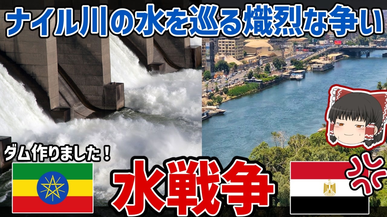 <span style="color: #ff0000; font-size: 18px;"><strong>エジプトはナイルの賜物</strong></span><br><br><br>よくそう言われますが、<br>ナイルの恵みはなにもエジプトだけに限ったものではなく、<br>他のアフリカ諸国にも多くの恵みをもたらしてきました。<br><br>そんなナイル川の水利用を巡り、<br>近年エジプトとエチオピアは熾烈な対立関係に発展してしまいました。<br><br><strong>今回はそんな両国の「水戦争」について解説してみました!</strong><br><br>※本動画は以前解説した内容を近年の情勢変化に合わせ、ブラッシュアップしたものになります※<br><br>ニコニコch始めました→<a href="https://ch.nicovideo.jp/africaoshi" target="_blank" rel="noopener nofollow">https://ch.nicovideo.jp/africaoshi</a><br><br>◆Twitter <a href="https://twitter.com/AfrikaanerMaris" target="_blank" rel="noopener nofollow">https://twitter.com/AfrikaanerMaris</a> <br>◆マイリスト <a href="https://www.nicovideo.jp/mylist/73354161" target="_blank" rel="noopener nofollow">https://www.nicovideo.jp/mylist/73354161</a><br>