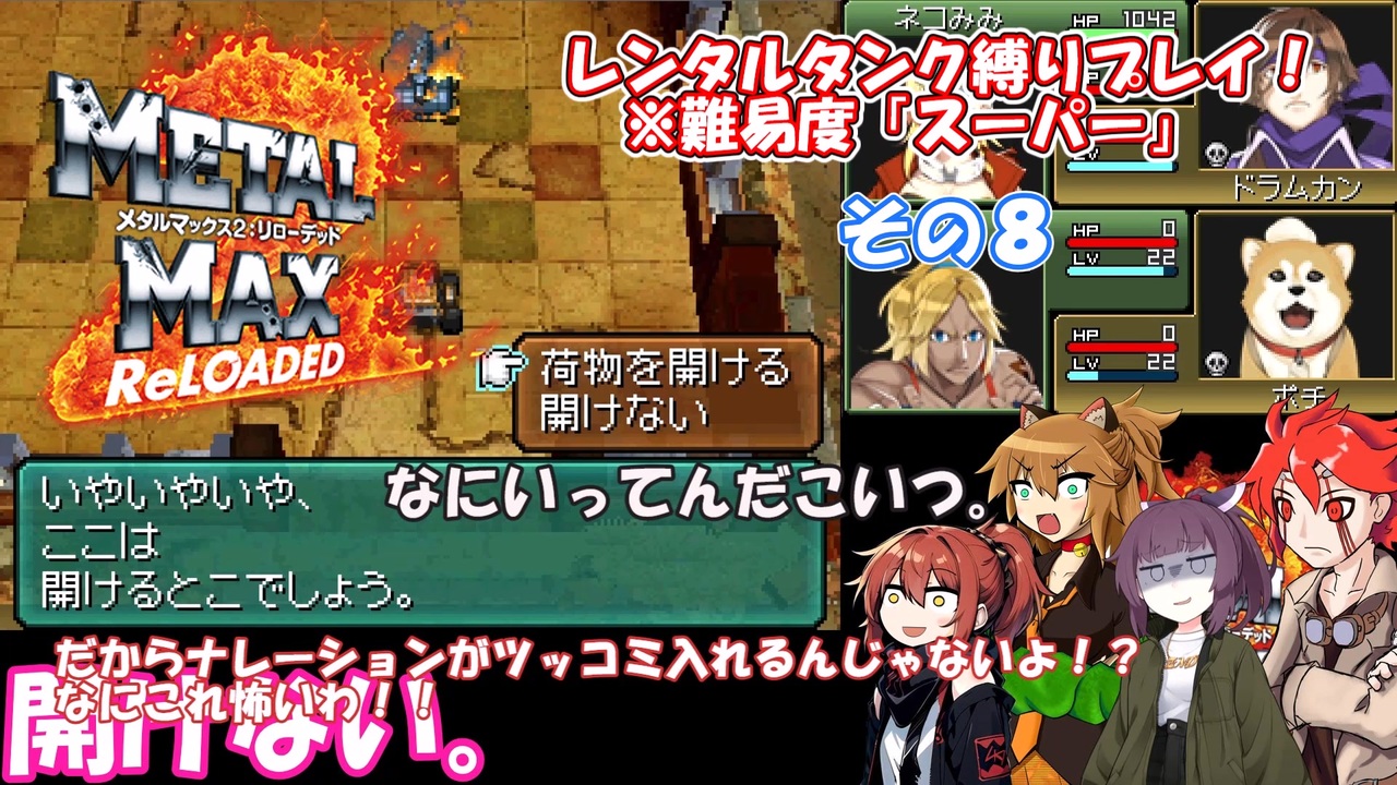 気が向いたら更新の失踪前提のメタルマックス2リローデッドの<br>はじめからスーパー難易度にレンタルタンクで挑戦するプレイです。<br><br>プレイ方針<br>・難易度 スーパー(<strong>能力3倍</strong> <span style="color: #ff0000;"><strong>最大HP5倍</strong></span>)<br>・レンタルタンクのみ(レンタルタンク購入可・牽引車は自由)<br>・二人以上の車両複数乗り禁止(ポチ含む)<br>可能な限り制限中(詰んだら解禁の可能性あり)<br>・レベルメタフィン・超改造の使用禁止<br><br><a href="https://www.nicovideo.jp/watch/sm45938819" class="watch">sm45938819</a> ←前 次→ <a href="https://www.nicovideo.jp/watch/sm45946643" class="watch">sm45946643</a><br>マイリスト → <a href="https://www.nicovideo.jp/mylist/63662015" target="_blank" rel="noopener">mylist/63662015</a> <br>その1リスト → <a href="https://www.nicovideo.jp/mylist/58364125" target="_blank" rel="noopener">mylist/58364125</a><br><br>※使用Voice(及び配役)<br>VOICEVOX:春日部つむぎ(ネコ耳) 青山龍星(ドラムカン)<br>Voiceroid:東北きりたん(立ち絵:このりEX様作 東北きりたん立ち絵素材5 <a href="https://seiga.nicovideo.jp/seiga/im10819054" target="_blank" rel="noopener">im10819054</a>)<br>CoeFont:アリアル(Voiced by <a href="https://CoeFont.cloud" target="_blank" rel="noopener nofollow">https://CoeFont.cloud</a>(490))