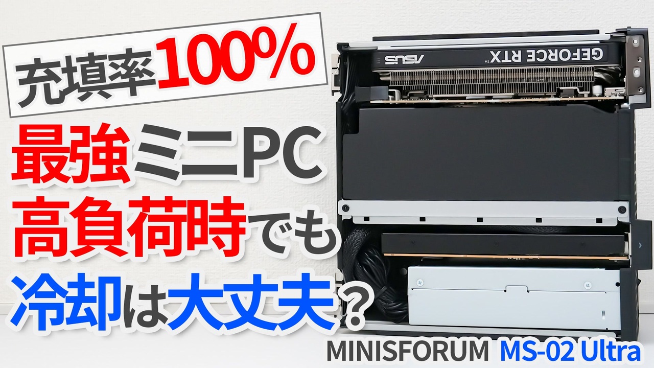 以前MS-02 Ultraをレビューした際は検証しなかった、RTX5060搭載状態での高負荷時の挙動に着目した動画です。<br>4.8Lの中で340Wを消費しているとは思えない冷却力で、正直感動しました。<br>失礼ながら燃えると思ってた。<br><br>■今回紹介したPC<br>「MINISFORUM MS-02 Ultra」<br>Amazon:<a href="https://amzn.to/4pa7UWk" target="_blank" rel="noopener nofollow">https://amzn.to/4pa7UWk</a><br>公式ストア:<a href="https://www.minisforum.jp/products/ms-02-ultra?aff=280" target="_blank" rel="noopener nofollow">https://www.minisforum.jp/products/ms-02-ultra?aff=280</a><br><br>CPU:Intel Core Ultra9 285HX(24コア24スレッド)<br>メモリ:DDR5-5600 32GB×2(空きスロット2)<br>SSD:PCIe4.0×4 1TB(空きスロット3)<br>GPU:ASUS GeForce RTX 5060 LP BRK 8GB<br>OS:Windows11 Pro<br>25GbE SFP+・10GbE RJ45<br>PCIe5.0×16・USB4 V2・Wi-Fi7<br>電源内蔵<br><br>■Amazonアソシエイト<br><a href="https://amzn.to/489hn7K" target="_blank" rel="noopener nofollow">https://amzn.to/489hn7K</a><br>このリンクを通じてAmazonの日々の買い物をしていただくと、当チャンネルの活動の支えになります。もしよければご使用ください…!<br><br>■Twitter(新製品情報やPC関連のネタを投稿しています)<br><a href="https://twitter.com/midou_pcmovie?t=CswQClbF7dbVc44bT__4JA&s=09" target="_blank" rel="noopener nofollow">https://twitter.com/midou_pcmovie?t=CswQClbF7dbVc44bT__4JA&s=09</a><br><br>※上記リンクにはAmazonアソシエイツリンク・アフィリエイトリンクを使用しています<br>#ゆっくり解説 #ミニPC #MINISFORUM